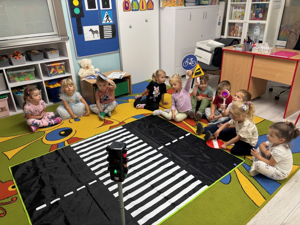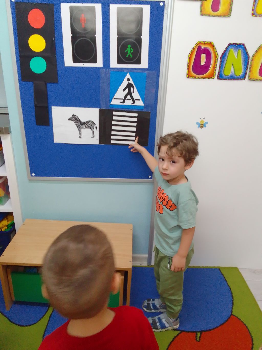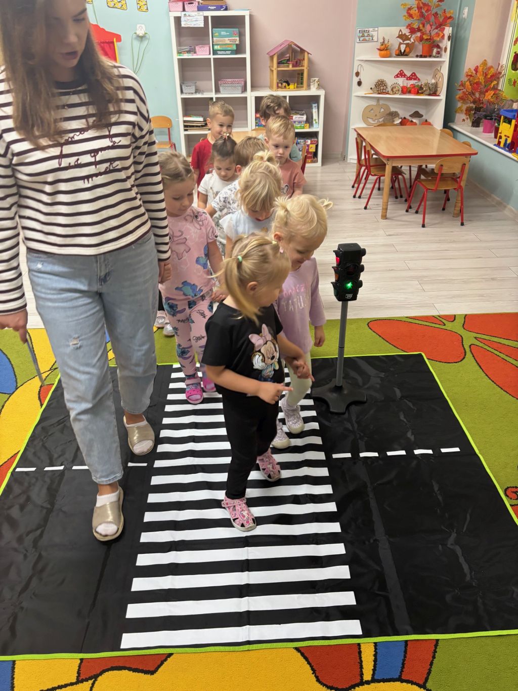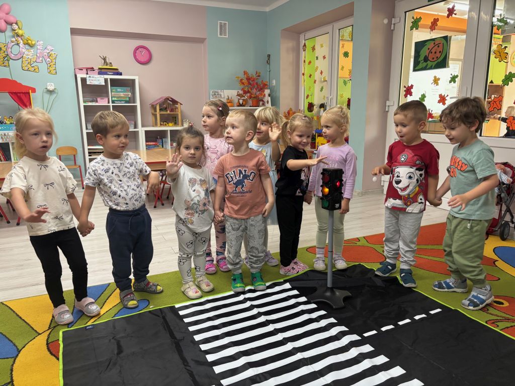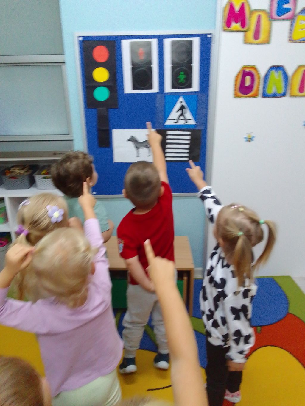 W ramach realizacji tematyki o bezpieczeństwie, dzieci z grupy "Pszczółek" poznały zasady bezpiecznego poruszania się po ulicy. Podczas zajęć słuchały rymowanki U. Piotrowskiej "Czerwone - stój, zielone - idź", poznały wygląd miejsca przeznaczonego dla pieszych oraz uczestniczyły w spacerze na skrzyżowanie, gdzie obserwowały ruch uliczny i sygnalizację świetlną.