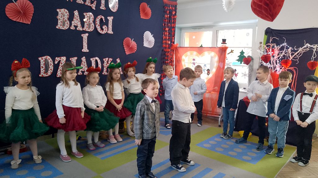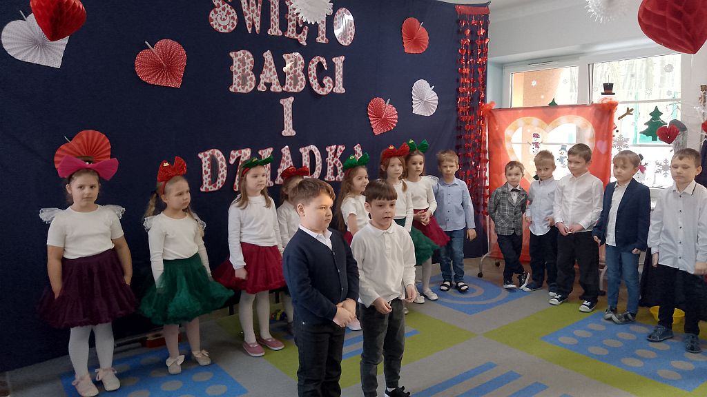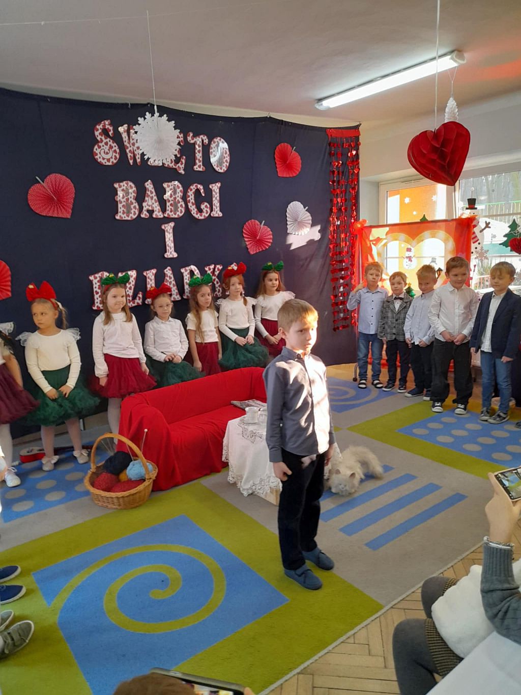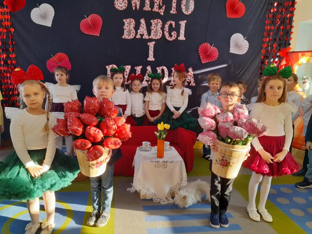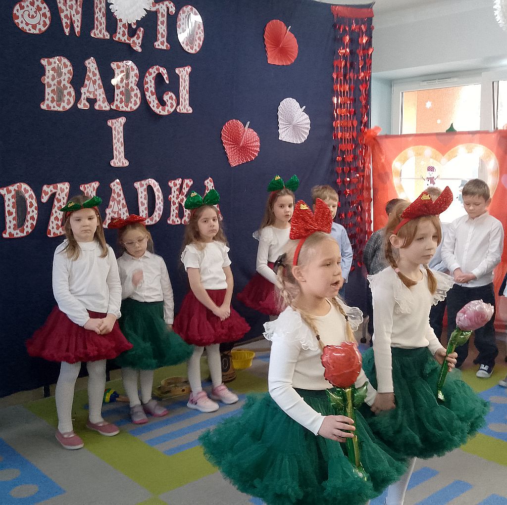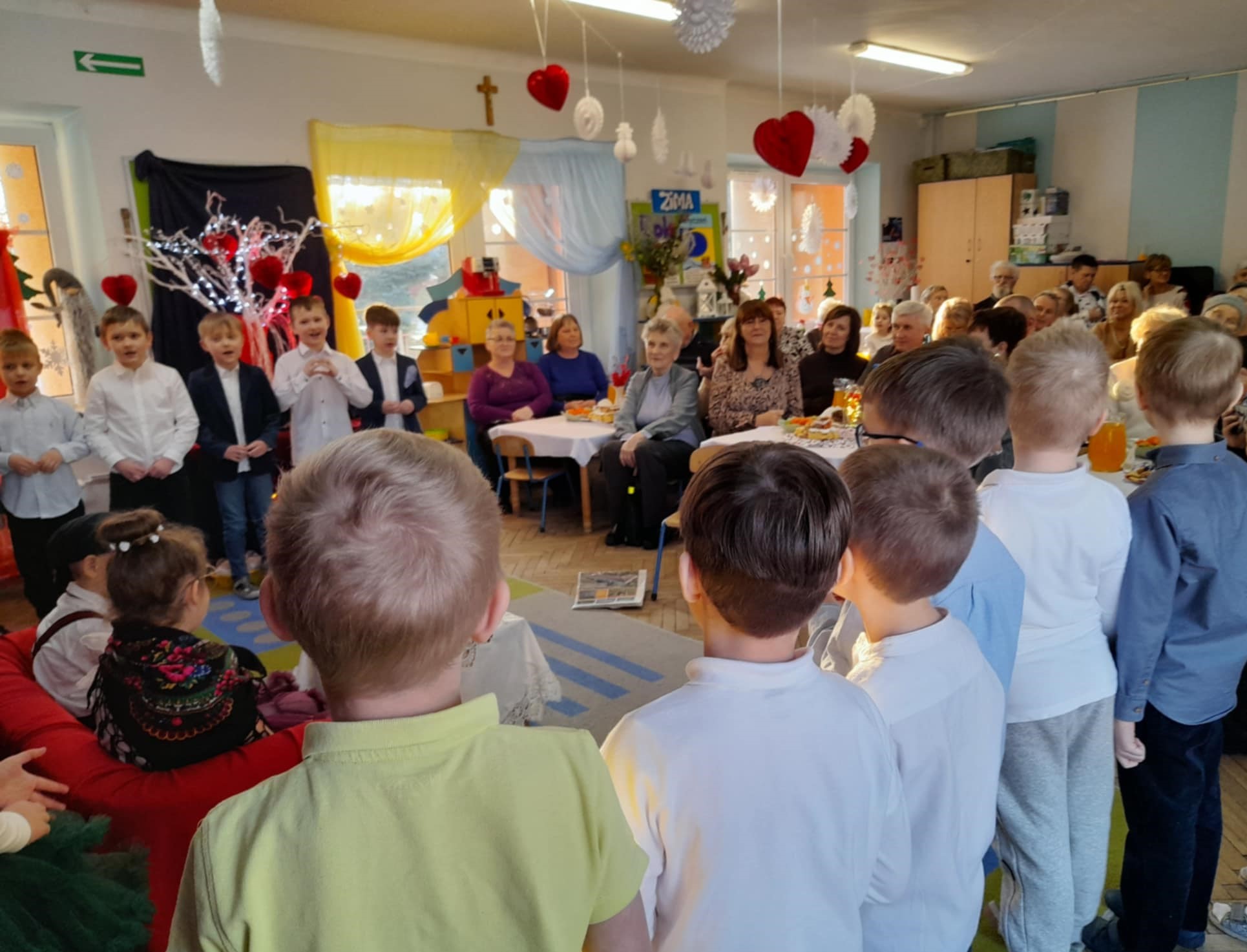 Dnia 22.02.2026 r. odbyła się w naszej grupie uroczystość z okazji Dnia Babci i Dziadka. Dzieci przygotowały dla zaproszonych gości program artystyczny, podczas którego śpiewały piosenki, recytowały wiersze, tańczyły Jive, przedstawiły inscenizację "Prezenty dla Babci i Dziadka” oraz instrumentację piosenki "Koncert dla Babci i dziadka". Wnuczęta złożyły również życzenia i wręczyły upominki. Babcie i Dziadkowie ze wzruszeniem patrzyli na swoje wnuki i brawami dziękowali za występy. Na koniec wszyscy mogli świętować przy wspólnym poczęstunku.