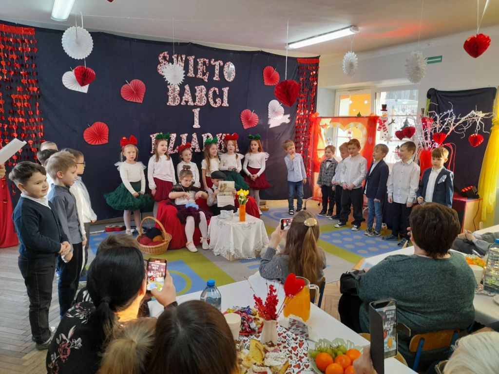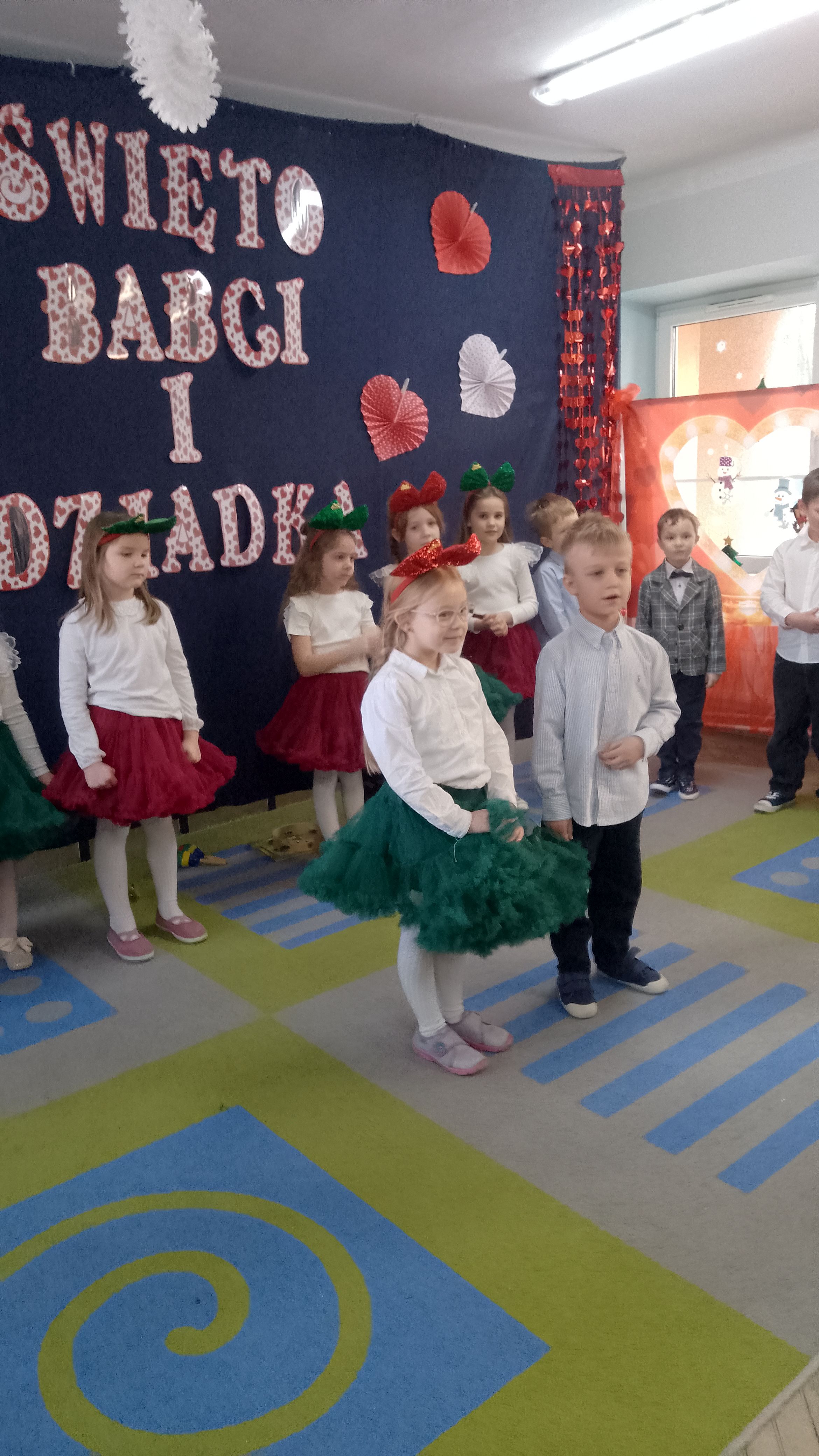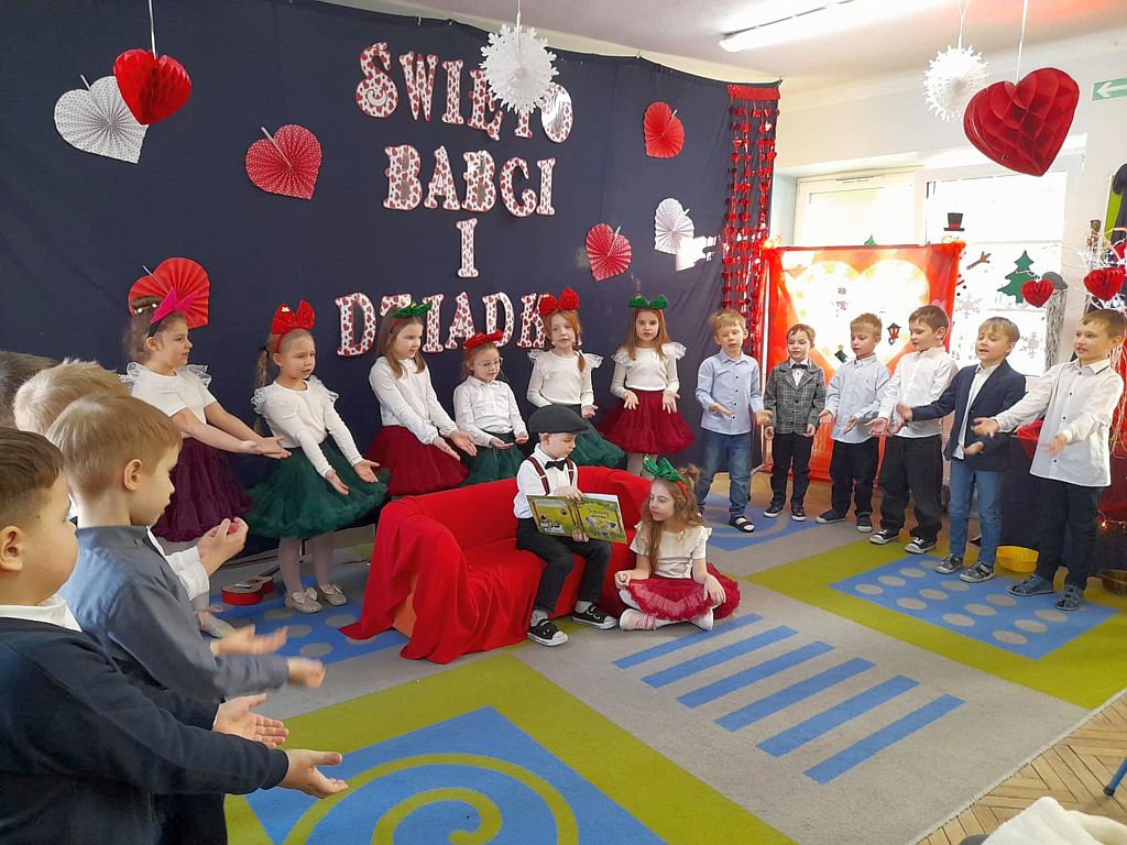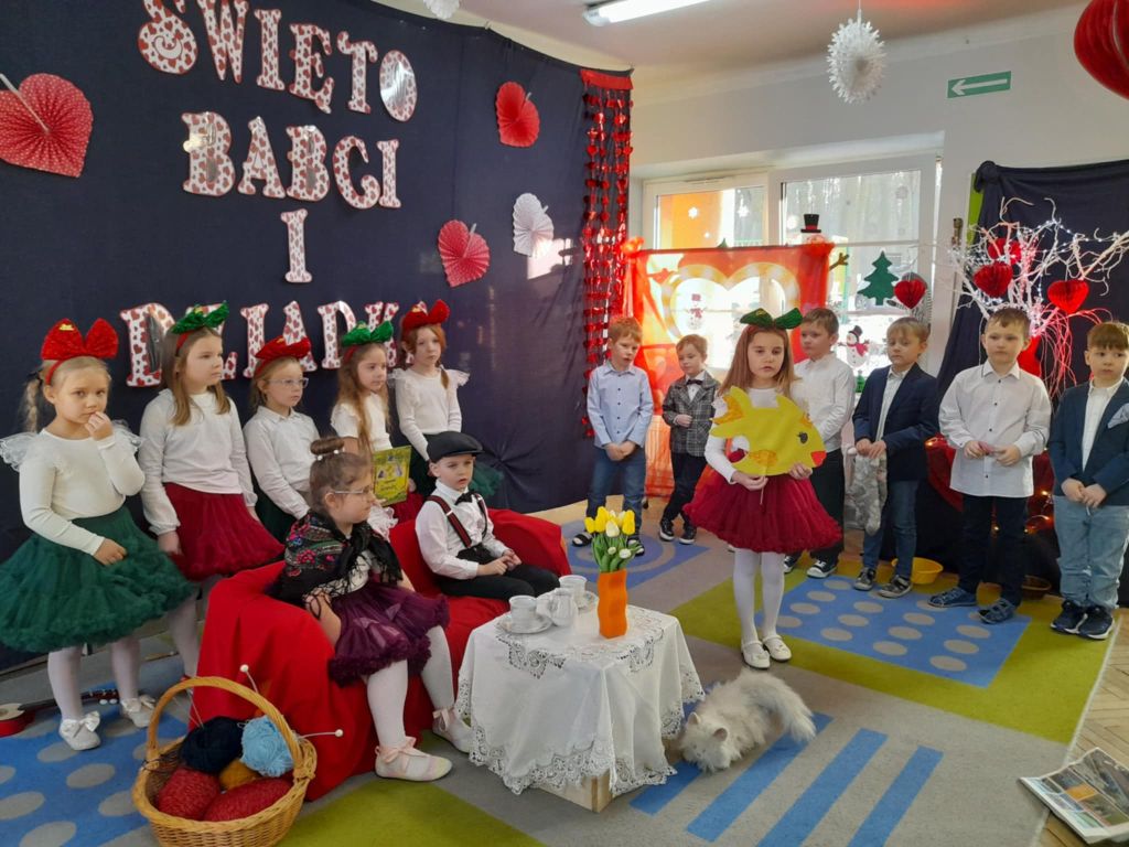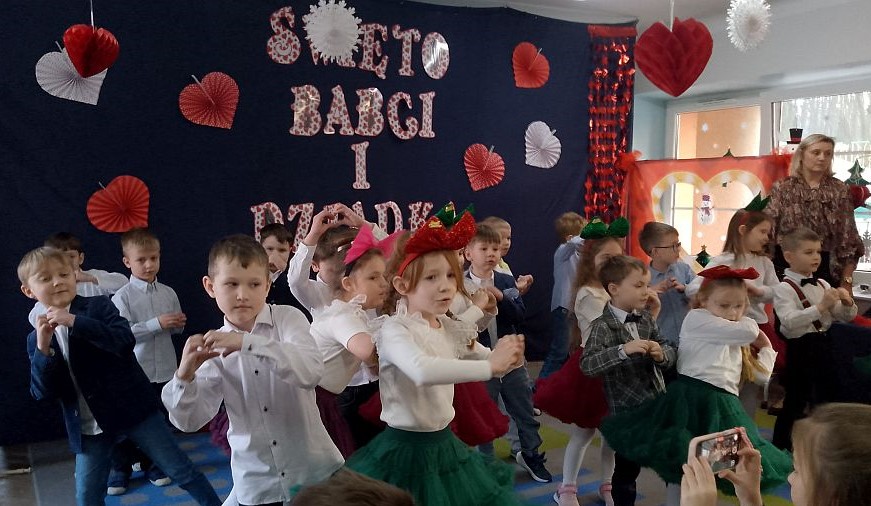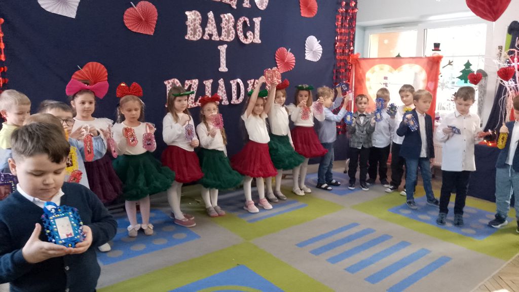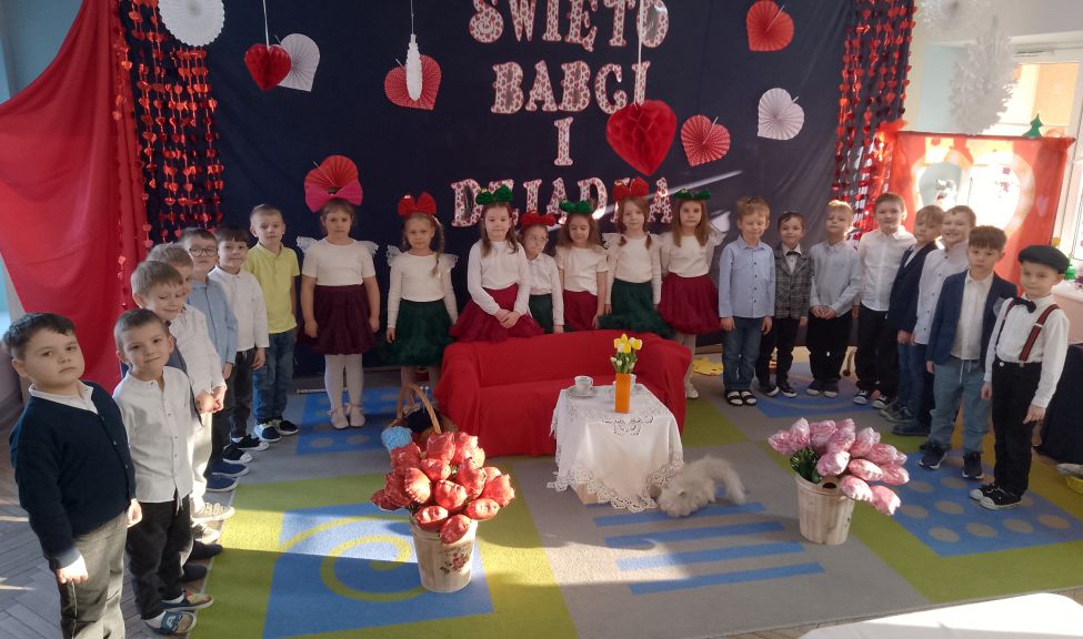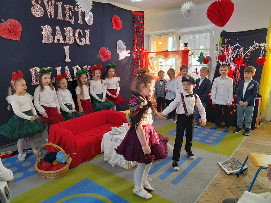 Dnia 22.02.2026 r. odbyła się w naszej grupie uroczystość z okazji Dnia Babci i Dziadka. Dzieci przygotowały dla zaproszonych gości program artystyczny, podczas którego śpiewały piosenki, recytowały wiersze, tańczyły Jive, przedstawiły inscenizację "Prezenty dla Babci i Dziadka” oraz instrumentację piosenki "Koncert dla Babci i dziadka". Wnuczęta złożyły również życzenia i wręczyły upominki. Babcie i Dziadkowie ze wzruszeniem patrzyli na swoje wnuki i brawami dziękowali za występy. Na koniec wszyscy mogli świętować przy wspólnym poczęstunku.