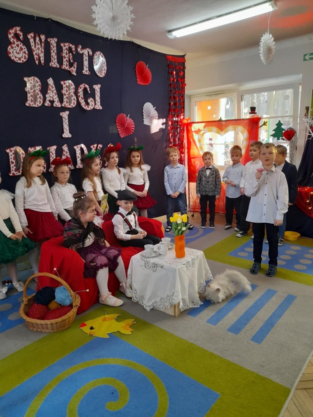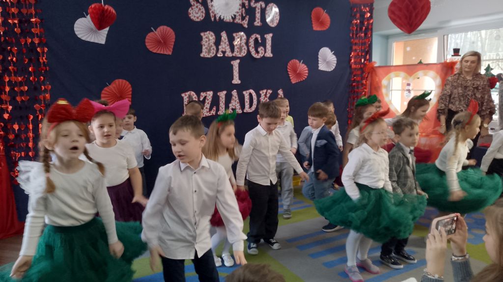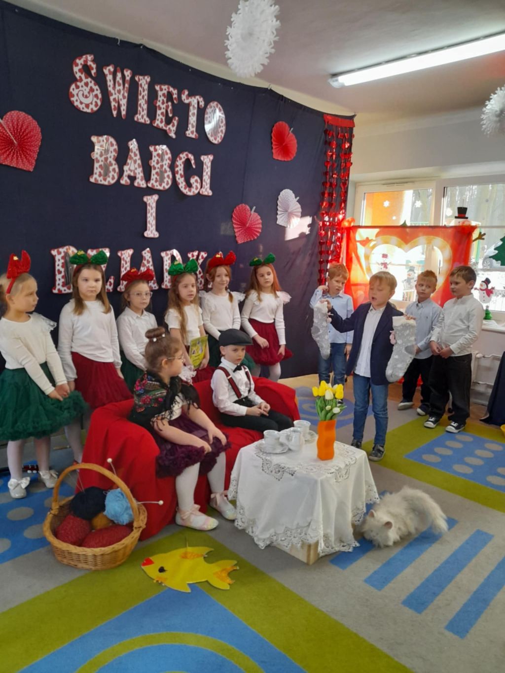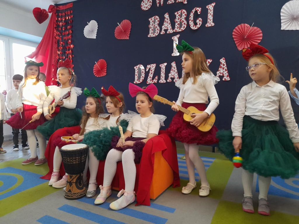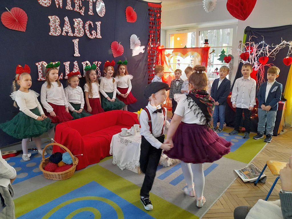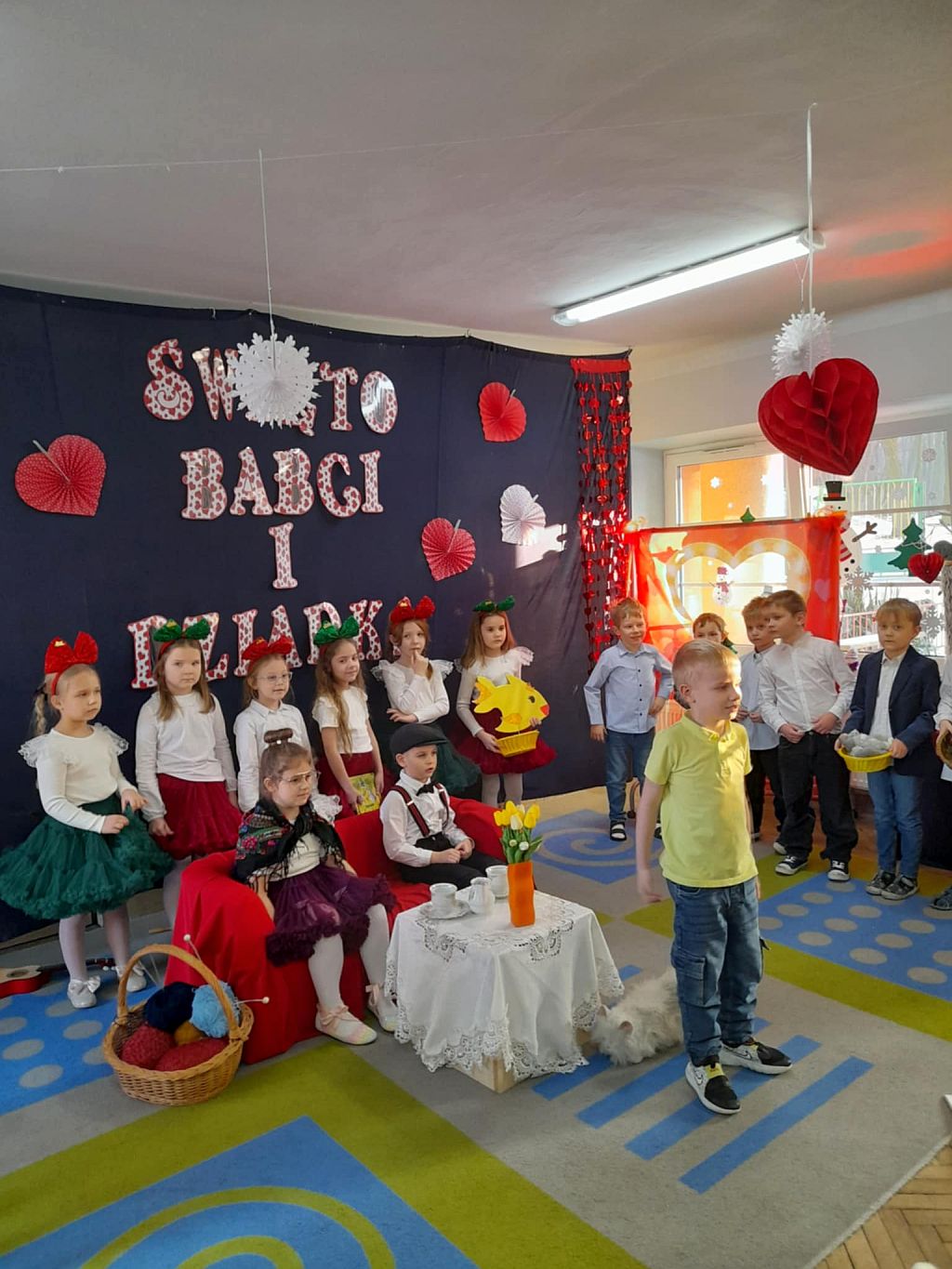 Dnia 22.02.2026 r. odbyła się w naszej grupie uroczystość z okazji Dnia Babci i Dziadka. Dzieci przygotowały dla zaproszonych gości program artystyczny, podczas którego śpiewały piosenki, recytowały wiersze, tańczyły Jive, przedstawiły inscenizację "Prezenty dla Babci i Dziadka” oraz instrumentację piosenki "Koncert dla Babci i dziadka". Wnuczęta złożyły również życzenia i wręczyły upominki. Babcie i Dziadkowie ze wzruszeniem patrzyli na swoje wnuki i brawami dziękowali za występy. Na koniec wszyscy mogli świętować przy wspólnym poczęstunku.