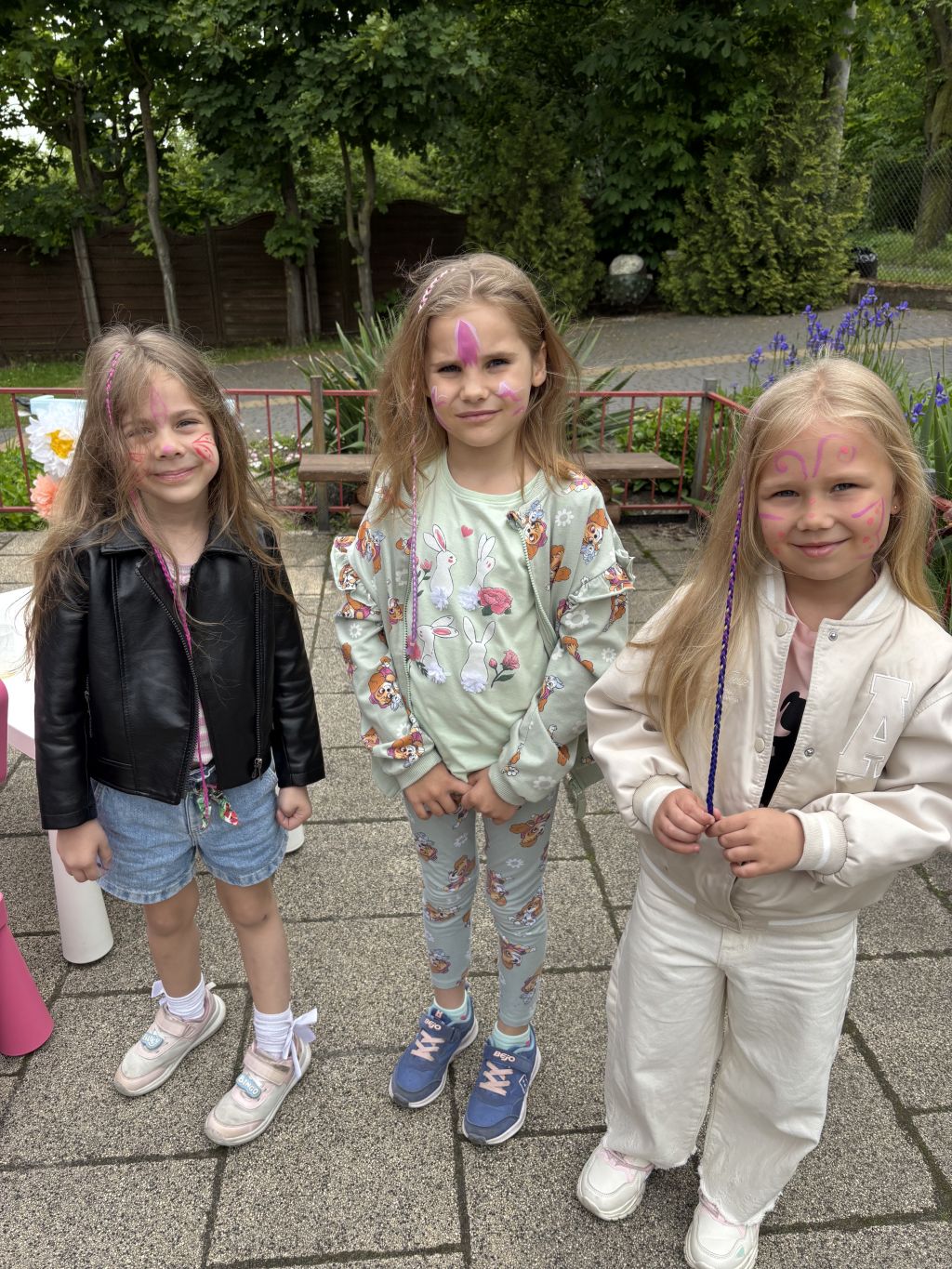 Dzień Dziecka, to jeden z najradośniejszych dni, na który tak bardzo czekają młodsze i starsze przedszkolaki. Dzięki sprzyjającej pogodzie mogliśmy zorganizować imprezę na świeżym powietrzu, gdzie czekało na dzieci mnóstwo przyjemności. Szczególną atrakcją były dmuchańce, malowanie twarzy, warkoczyki i tatuaże. Były również tańce, pląsy przy muzyce oraz upominki ufundowane przez Rodziców. Nie zabrakło również poczęstunku: owoce, pyszna wata cukrowa, soki, chrupki. Impreza dostarczyła wielu emocji i niezapomnianych wrażeń. To był wyjątkowy i bardzo udany dzień, co można zobaczyć na dołączonych zdjęciach. Dziękujemy!