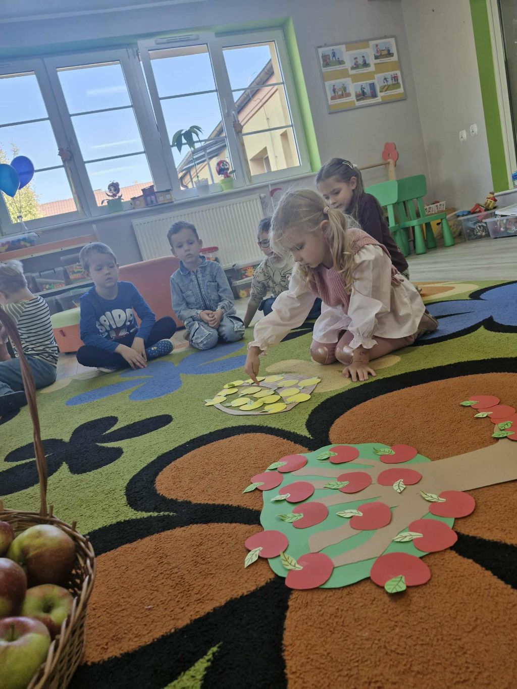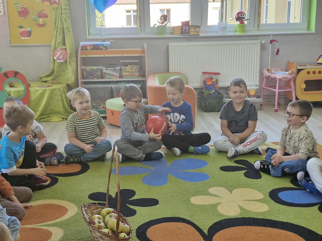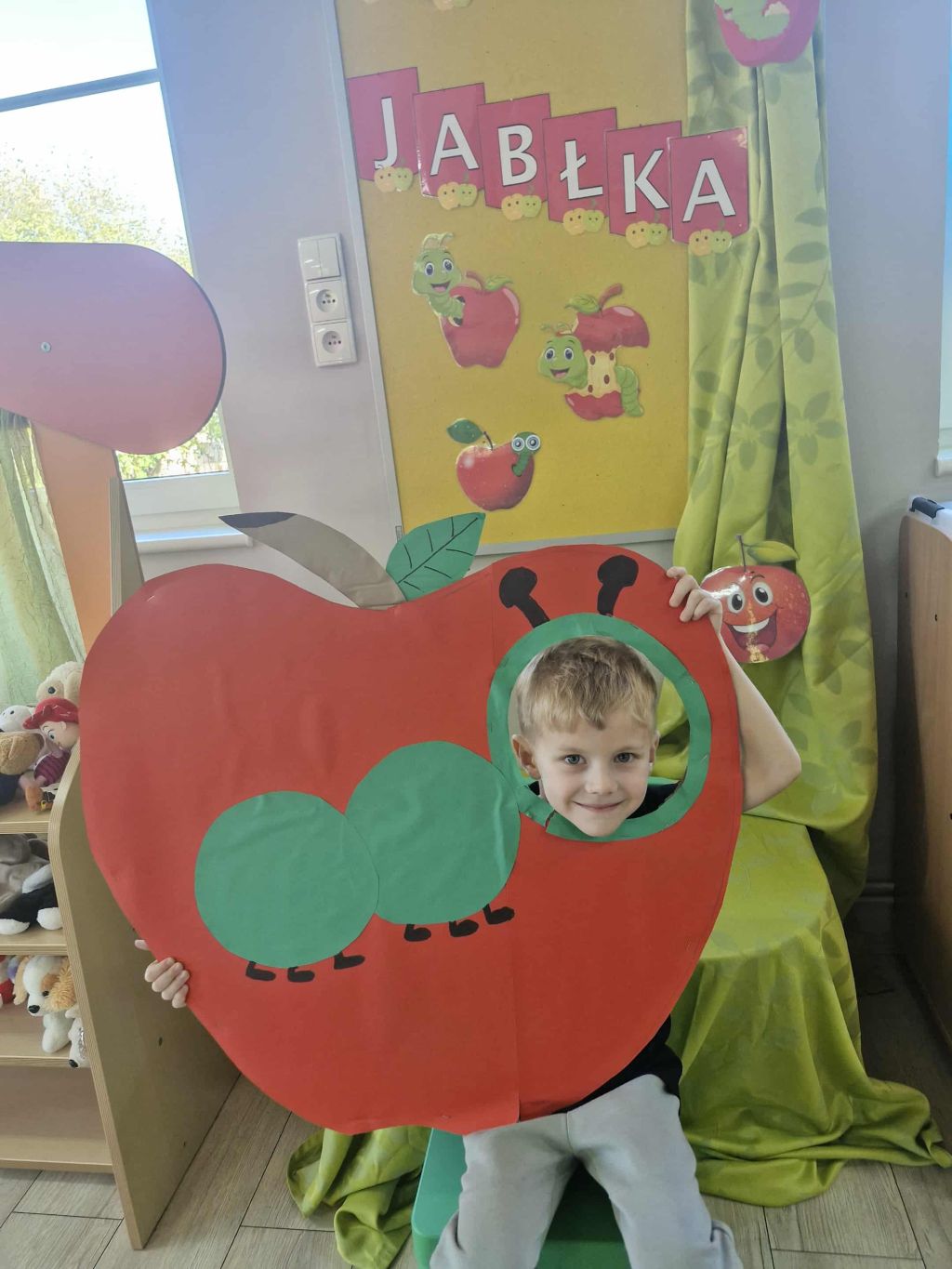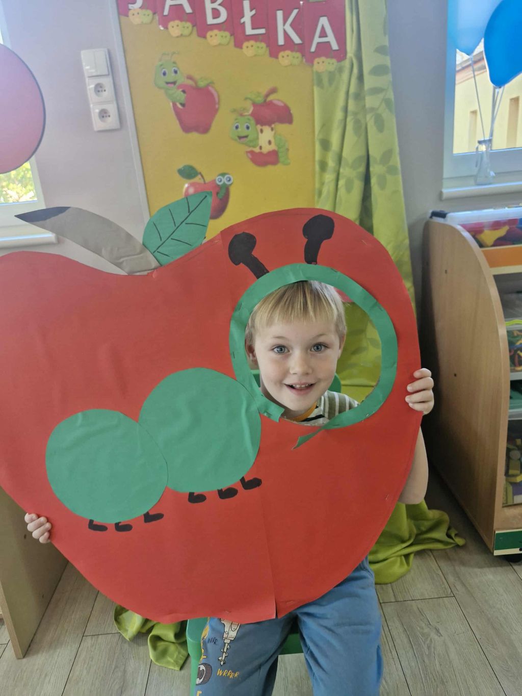 Jabłko jest jednym z najpopularniejszych owoców w naszym kraju i na świecie. Co czwarte jabłko w Europie pochodzi właśnie z Polski. Celem zajęć było zachęcenie dzieci do spożywania jabłek i ich przetworów jako źródła witamin. Obchody tego wyjątkowego dnia rozpoczęliśmy od rozmów na temat jego wyglądu, kolorów, wielkości, kształtu, smaku, różnych odmian, dlaczego warto je jeść, pod jaką postacią. Dzieci obejrzały film edukacyjny oraz bajkę „Jabłuszko”, wzięły udział w zabawie „slalom z jabłkiem, Przeliczały i segregowały jabłka ze względu na ich kolor oraz stworzyły zbiorowe prace plastyczne. Na koniec dnia nie mogło zabraknąć degustacji jabłek oraz oczywiście pamiątkowych zdjęć w foto – budce.