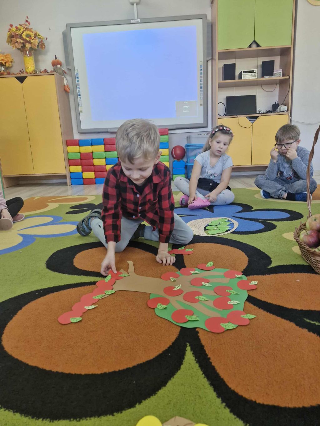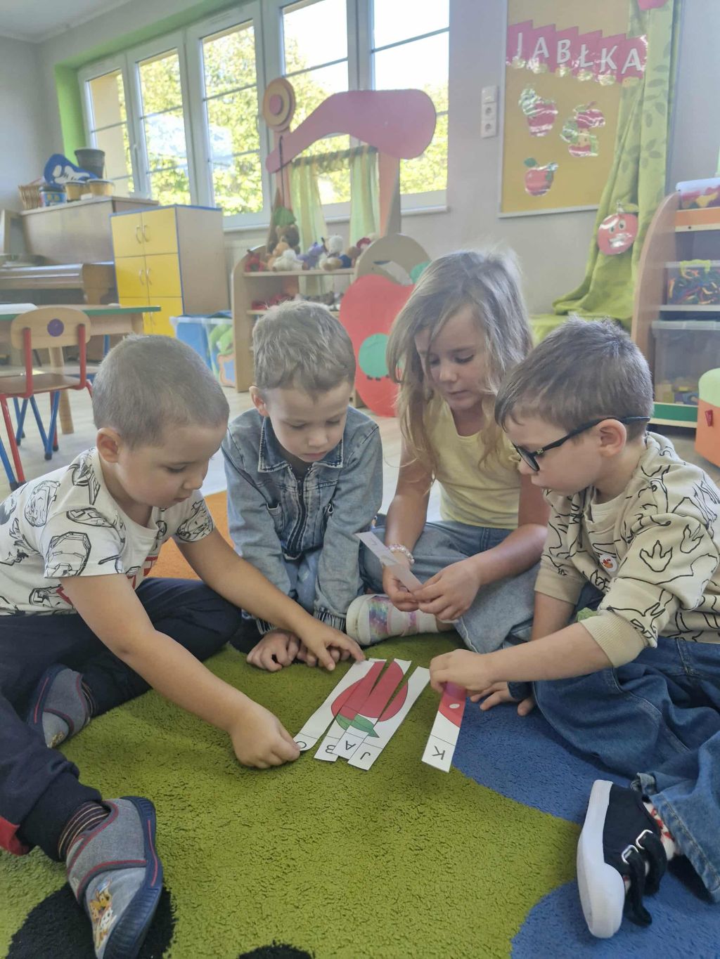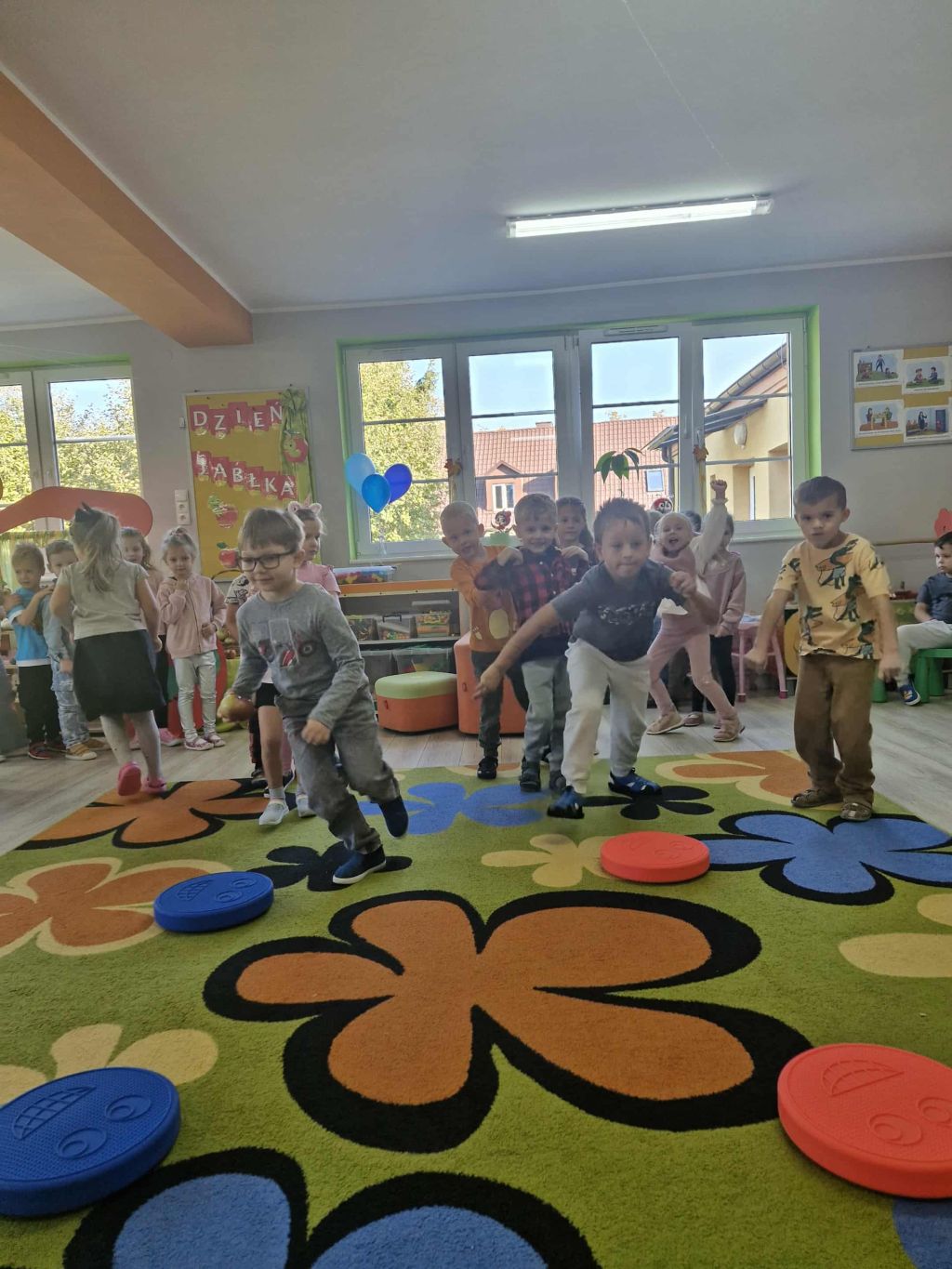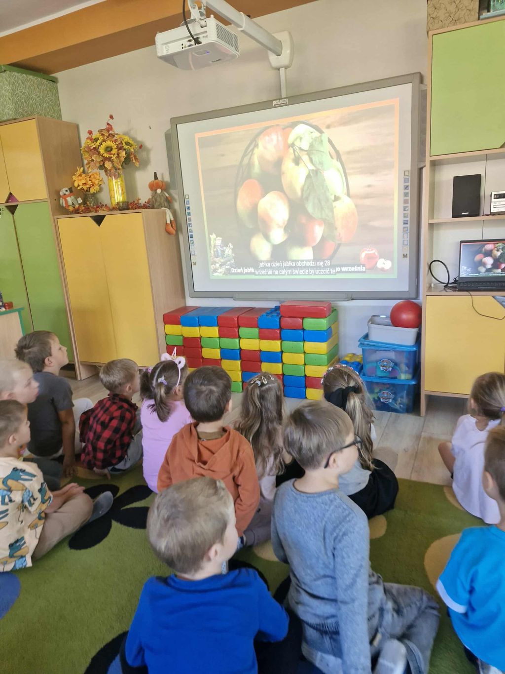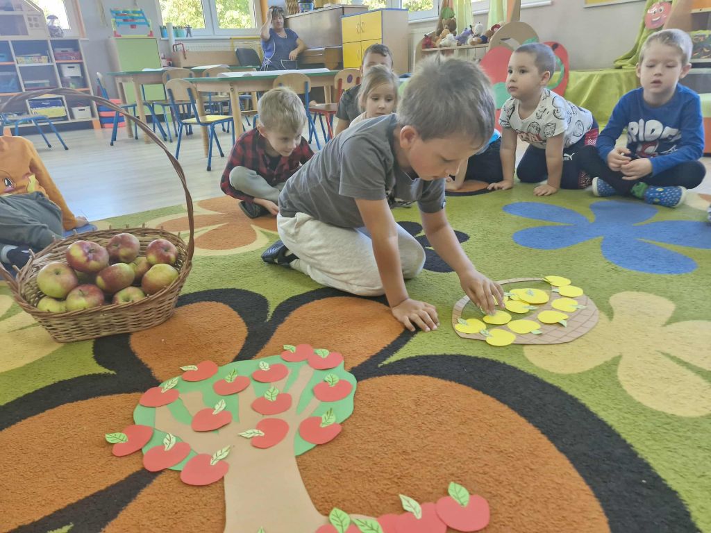 Jabłko jest jednym z najpopularniejszych owoców w naszym kraju i na świecie. Co czwarte jabłko w Europie pochodzi właśnie z Polski. Celem zajęć było zachęcenie dzieci do spożywania jabłek i ich przetworów jako źródła witamin. Obchody tego wyjątkowego dnia rozpoczęliśmy od rozmów na temat jego wyglądu, kolorów, wielkości, kształtu, smaku, różnych odmian, dlaczego warto je jeść, pod jaką postacią. Dzieci obejrzały film edukacyjny oraz bajkę „Jabłuszko”, wzięły udział w zabawie „slalom z jabłkiem, Przeliczały i segregowały jabłka ze względu na ich kolor oraz stworzyły zbiorowe prace plastyczne. Na koniec dnia nie mogło zabraknąć degustacji jabłek oraz oczywiście pamiątkowych zdjęć w foto – budce.