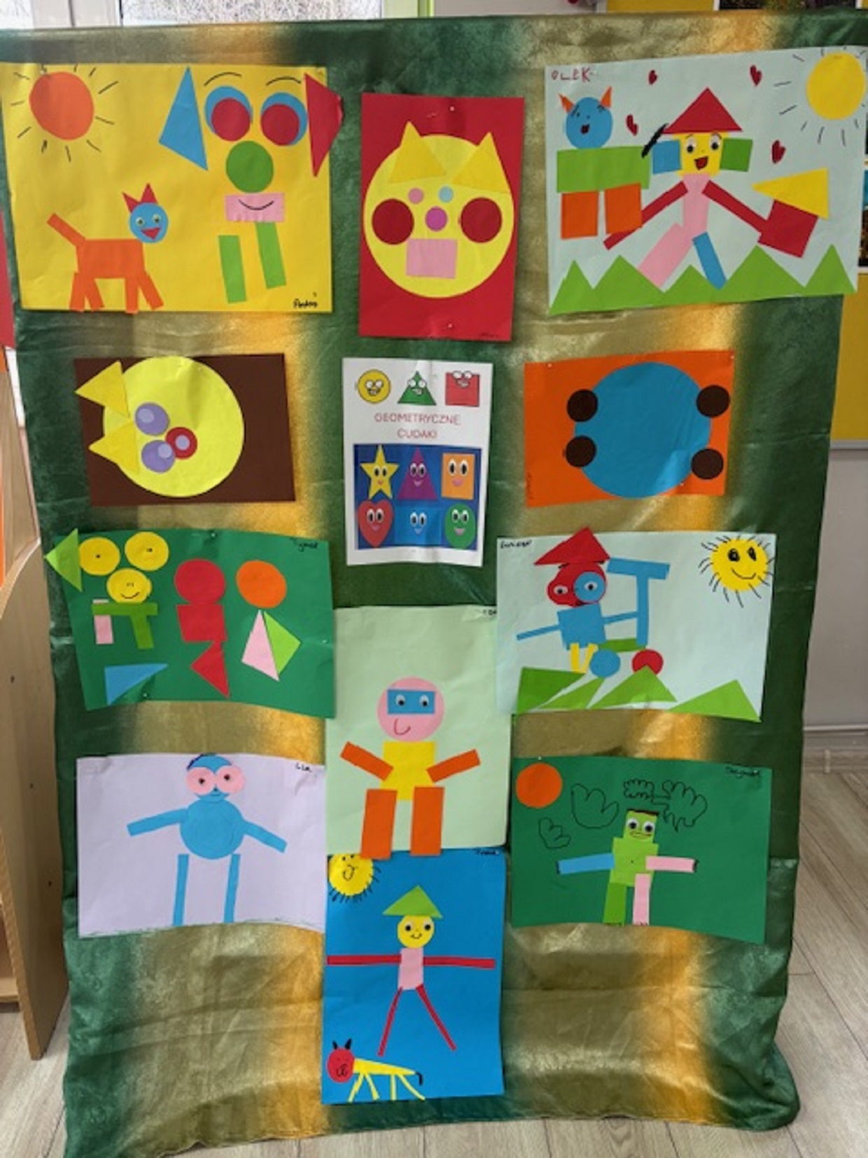 Na wystawie "Geometryczne Cudaki" prezentujemy wyjątkowe prace naszych przedszkolaków. Dzieci wykorzystując podstawowe figury geometryczne, stworzyły niepowtarzalne postacie – pełne humoru, koloru i kreatywności. Wystawa pokazuje, jak poprzez zabawę i sztukę najmłodsi uczą się kształtów, rozwijają wyobraźnię oraz zdolności manualne.