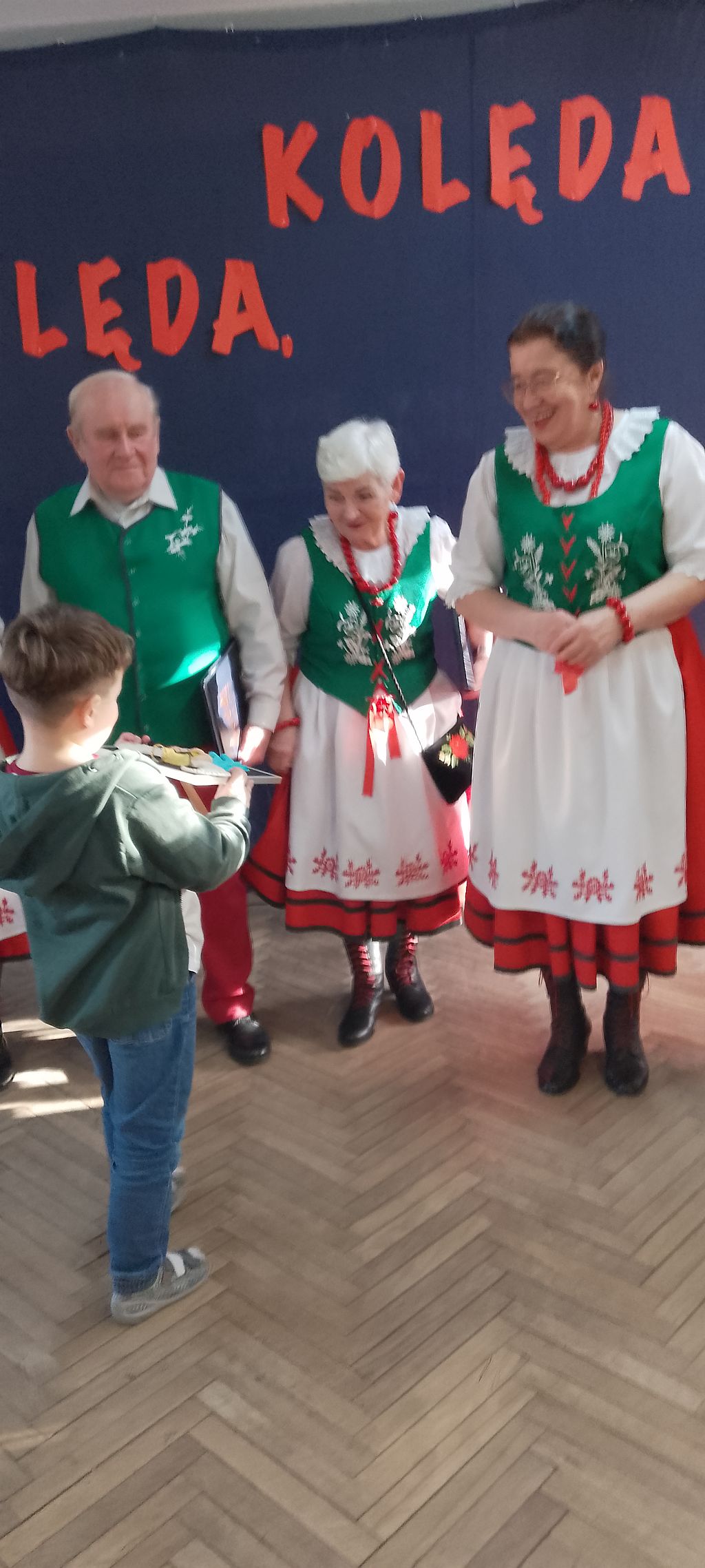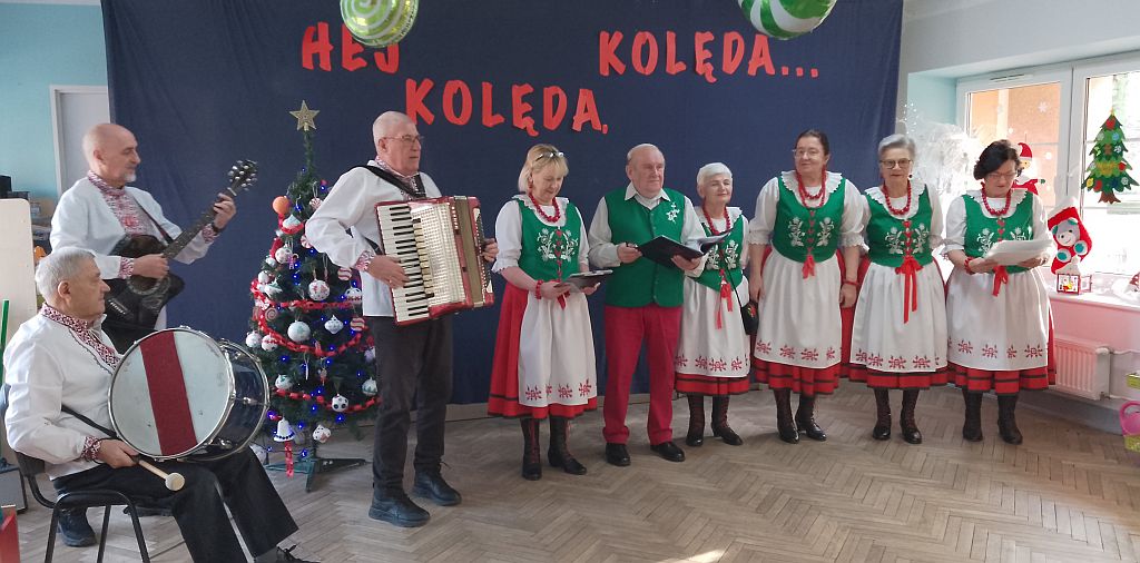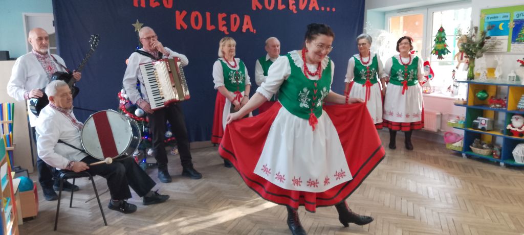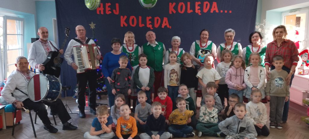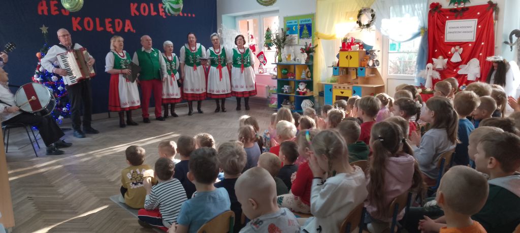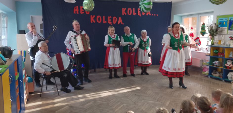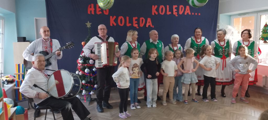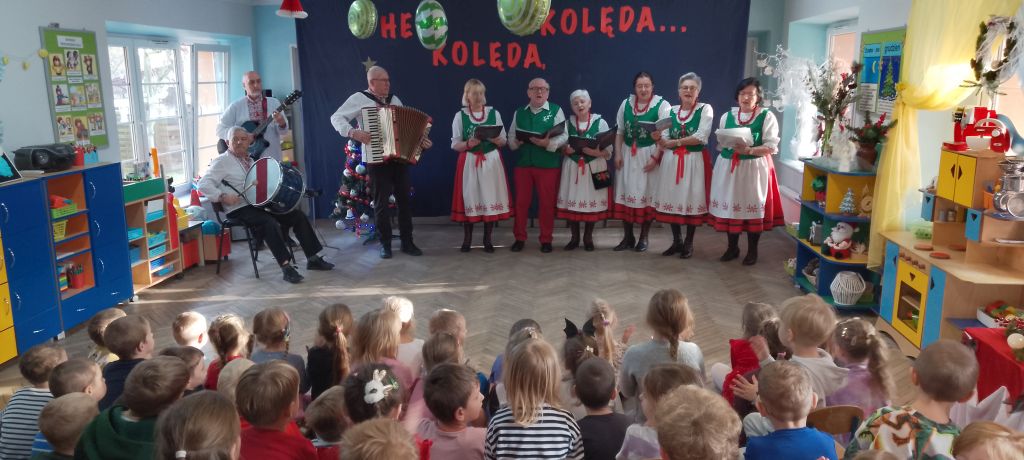 Dnia 17.12.2025 r. odwiedził nasze przedszkole Ludowy Zespół Wokalno-Instrumentalny "Leszczynianki". Spotkanie odbyło się w ramach grantu "Sięgnij, gdzie wzrok nie sięga - Kutnowskie Granty Oświatowe" - Projekt edukacyjny "Urok Świąt Bożego Narodzenia naszego regionu". Zaproszeni goście zagrali i zaśpiewali piękne polskie kolędy. Występ zachwycił dzieci i dorosłych. Wszyscy włączyli się do wspólnego kolędowania. Było to dla przedszkolaków duże przeżycie oraz okazja do kultywowania tradycji Świąt Bożego Narodzenia.