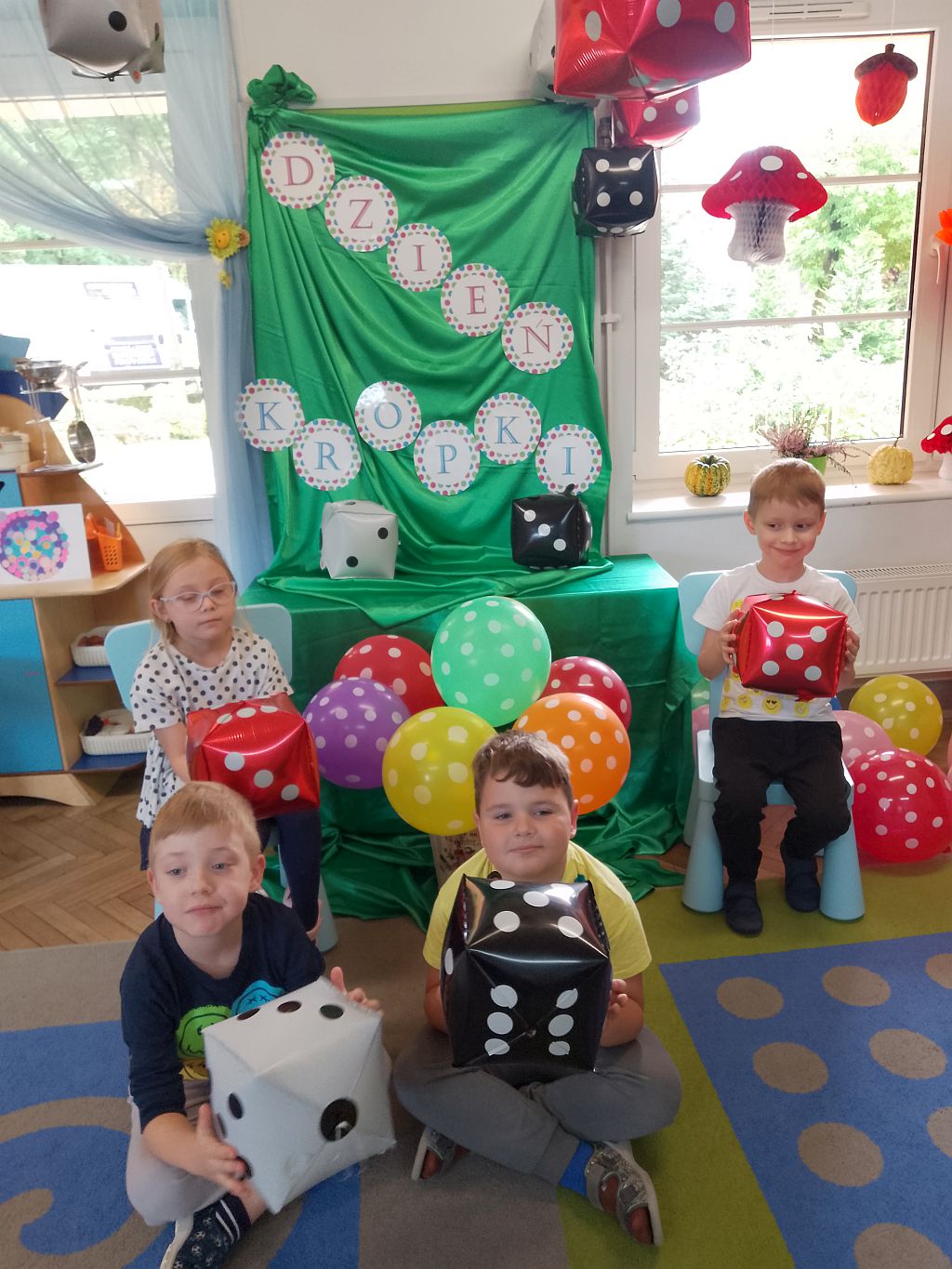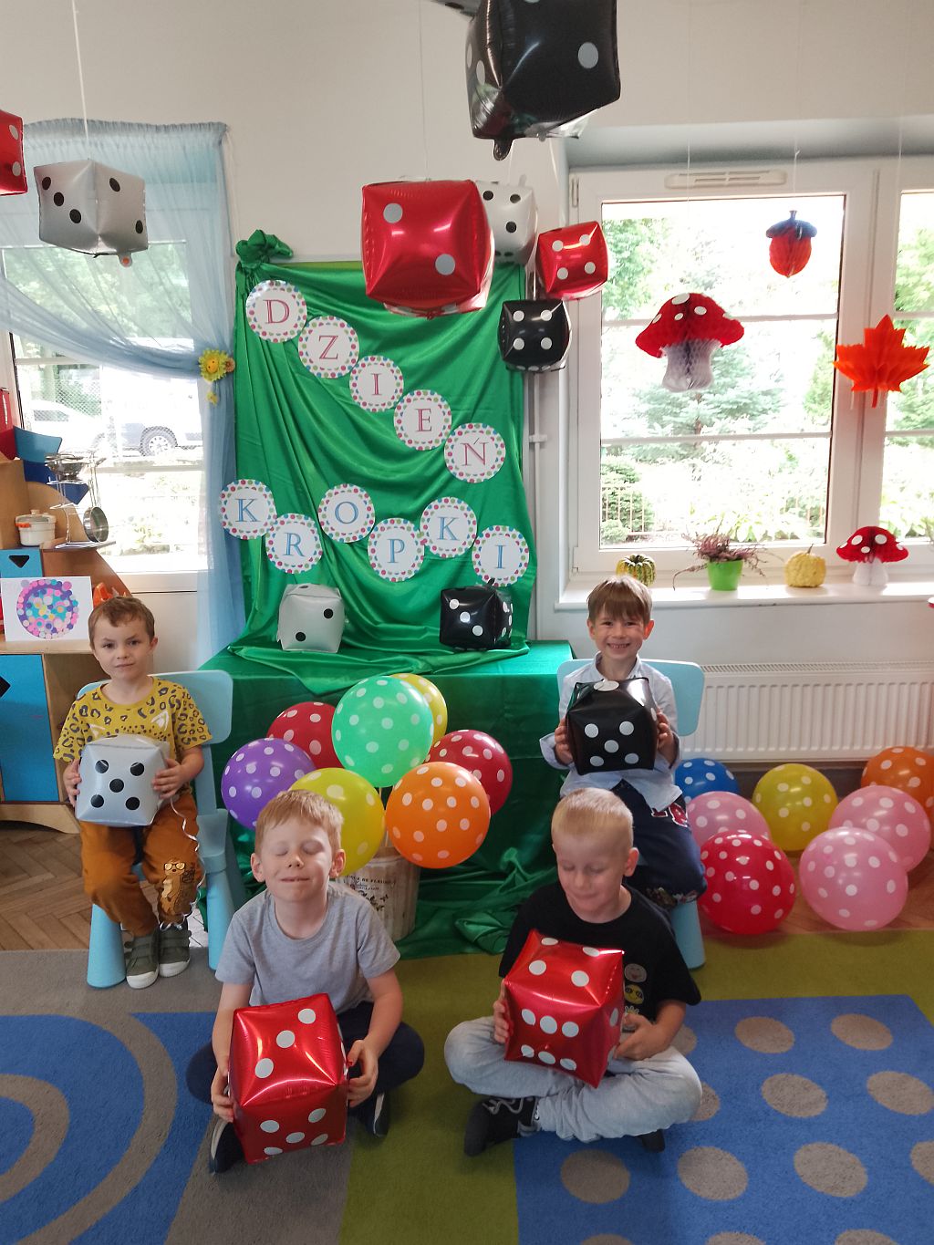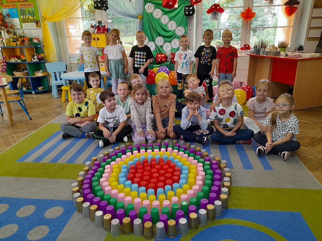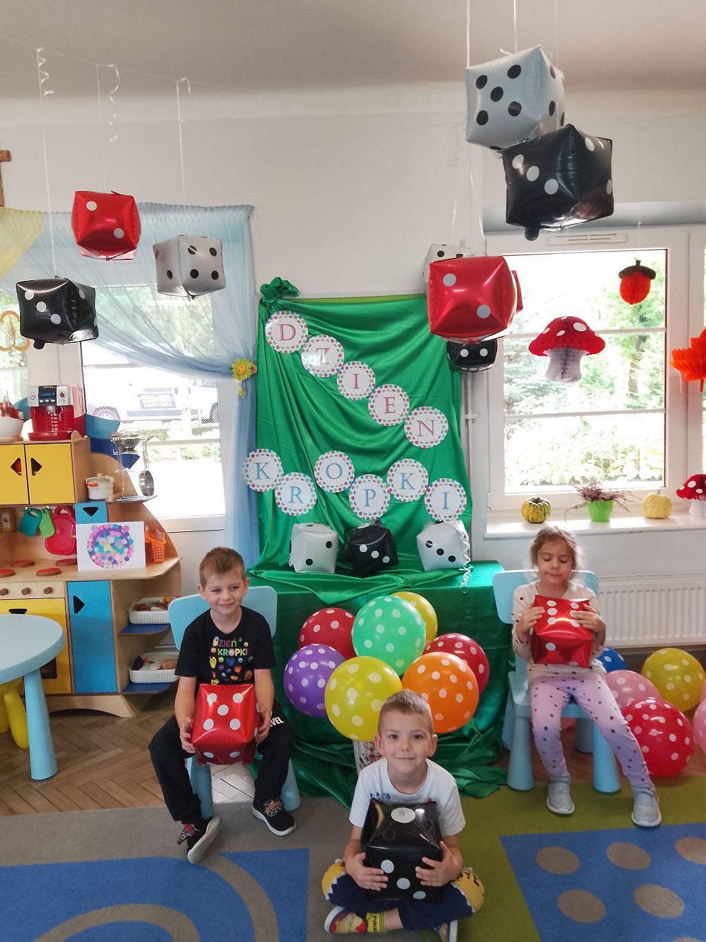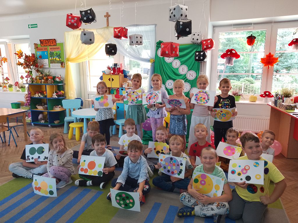 15.09.2025 r. dzieci obchodziły święto kreatywności czyli "Dzień Kropki". Inspiracją do wspólnego świętowania była bajka pt. "Kropka". Przedszkolaki z radością uczestniczyły w zabawach z kropką w roli głównej: układały kropkę z kolorowych kubeczków, brały udział w grach interaktywnych z wykorzystaniem tablicy multimedialnej, w kropkowej gimnastyce, zabawach przy muzyce, a także z wykorzystaniem chusty animacyjnej i balonów w kropki. Wykonały również pracę plastyczną tworząc kropkowe dzieła.