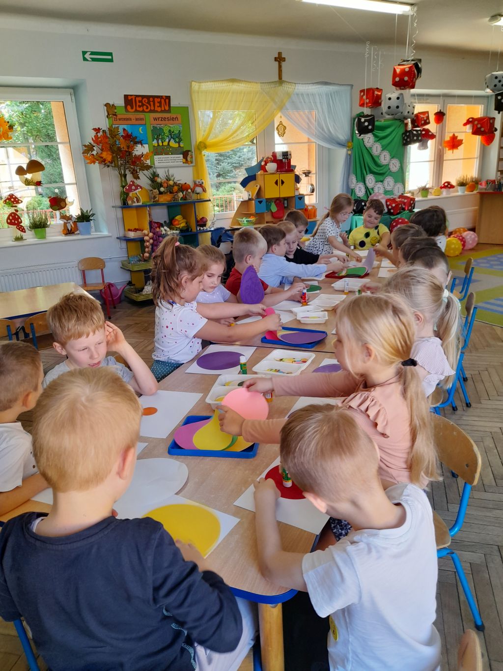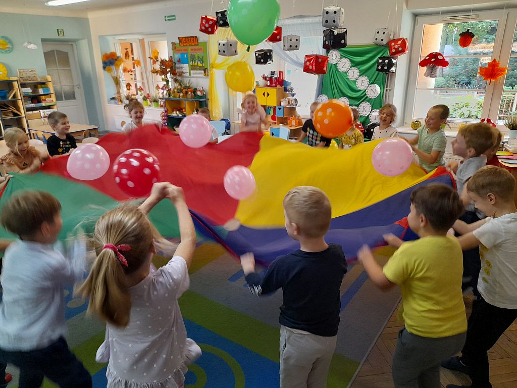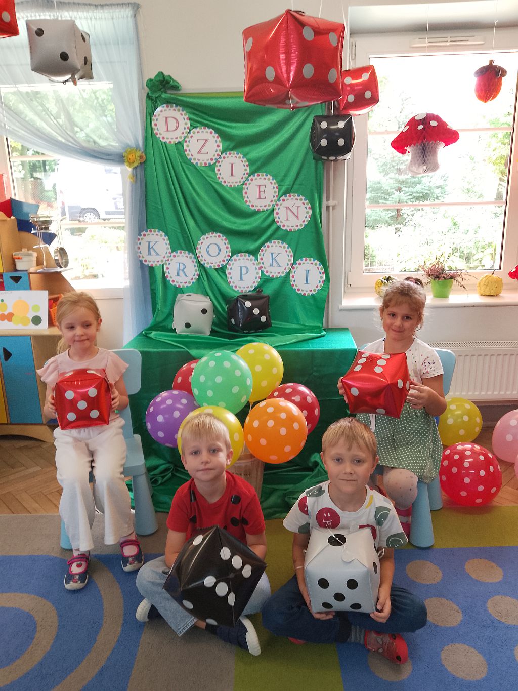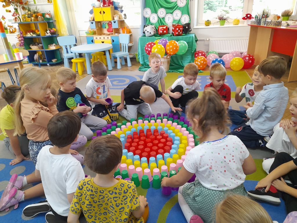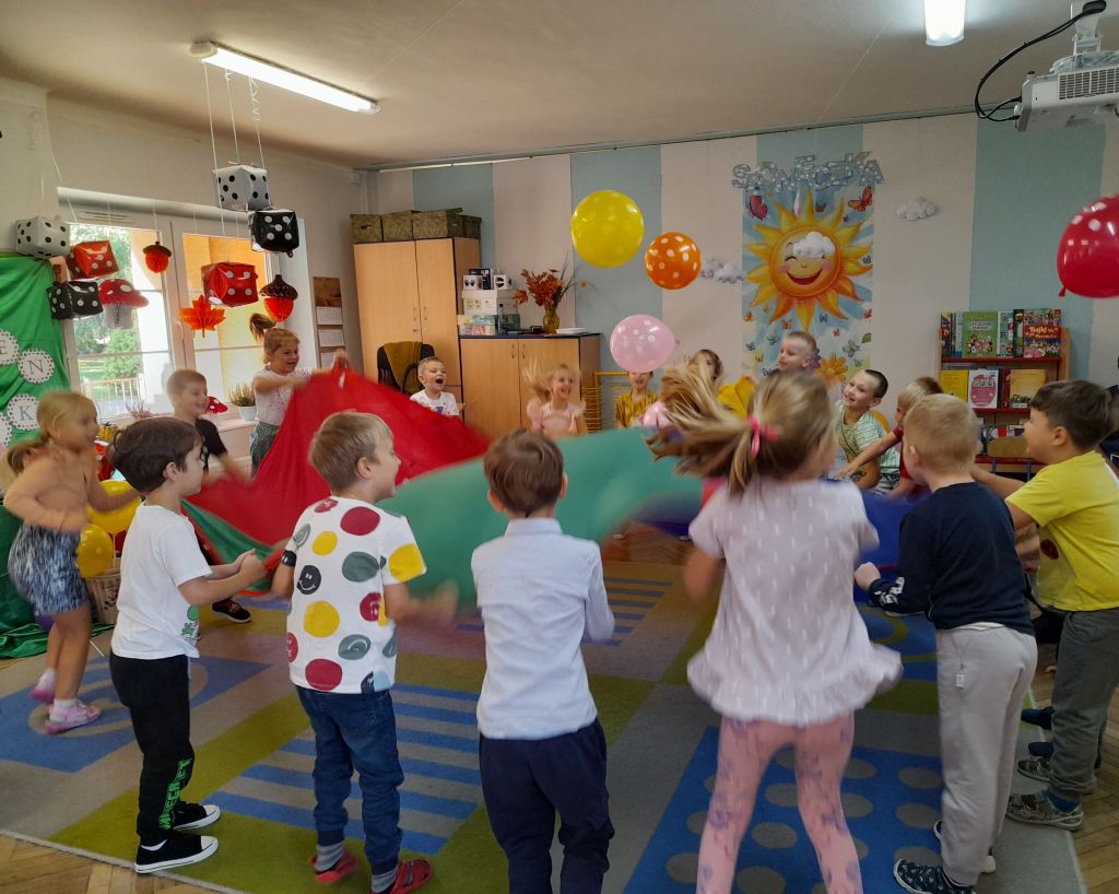 15.09.2025 r. dzieci obchodziły święto kreatywności czyli "Dzień Kropki". Inspiracją do wspólnego świętowania była bajka pt. "Kropka". Przedszkolaki z radością uczestniczyły w zabawach z kropką w roli głównej: układały kropkę z kolorowych kubeczków, brały udział w grach interaktywnych z wykorzystaniem tablicy multimedialnej, w kropkowej gimnastyce, zabawach przy muzyce, a także z wykorzystaniem chusty animacyjnej i balonów w kropki. Wykonały również pracę plastyczną tworząc kropkowe dzieła.