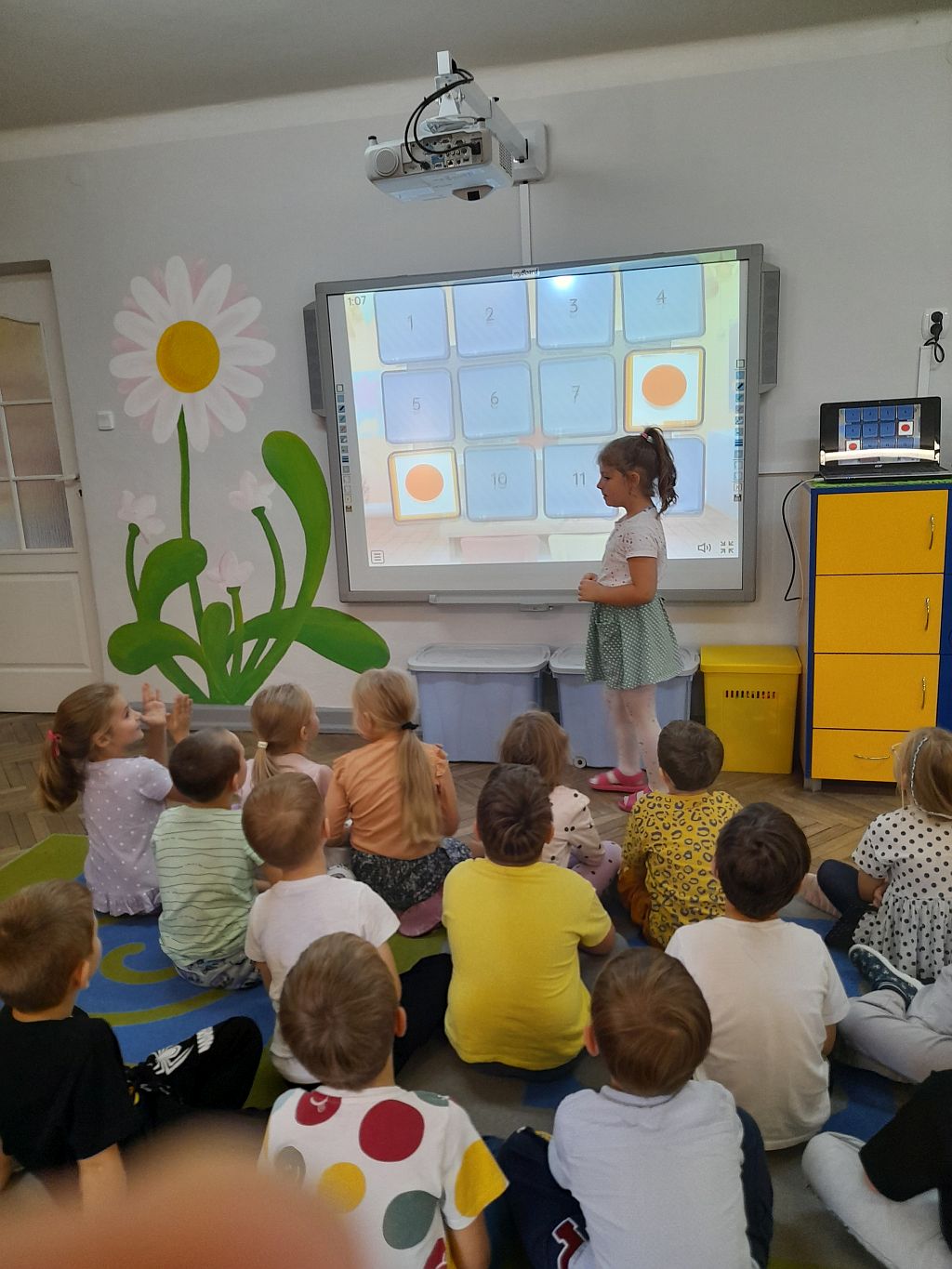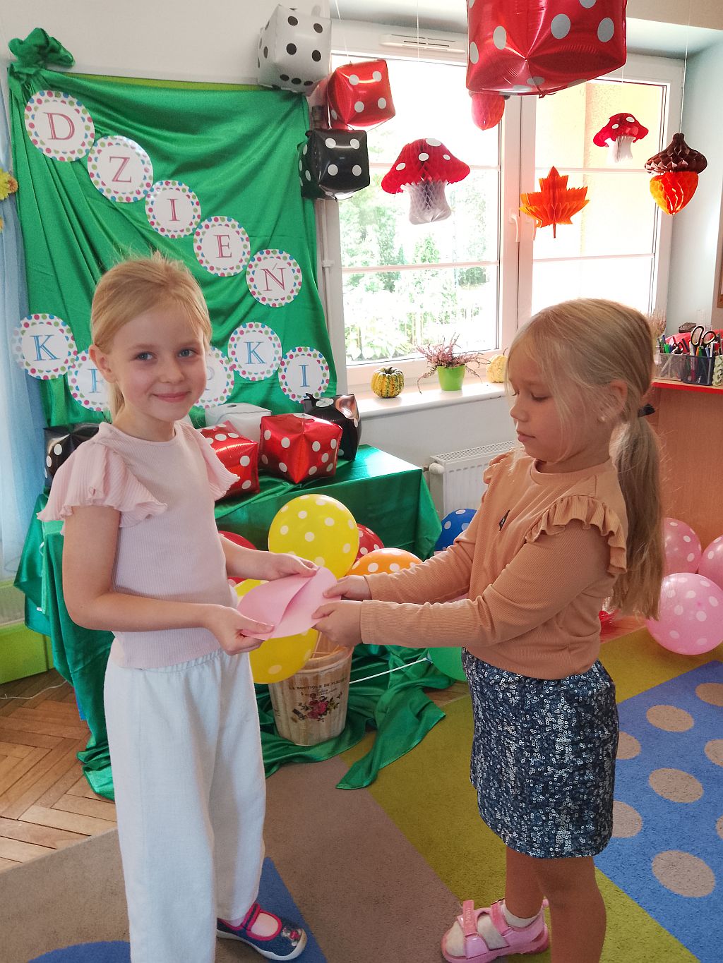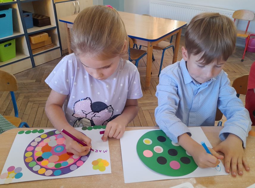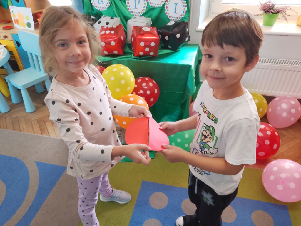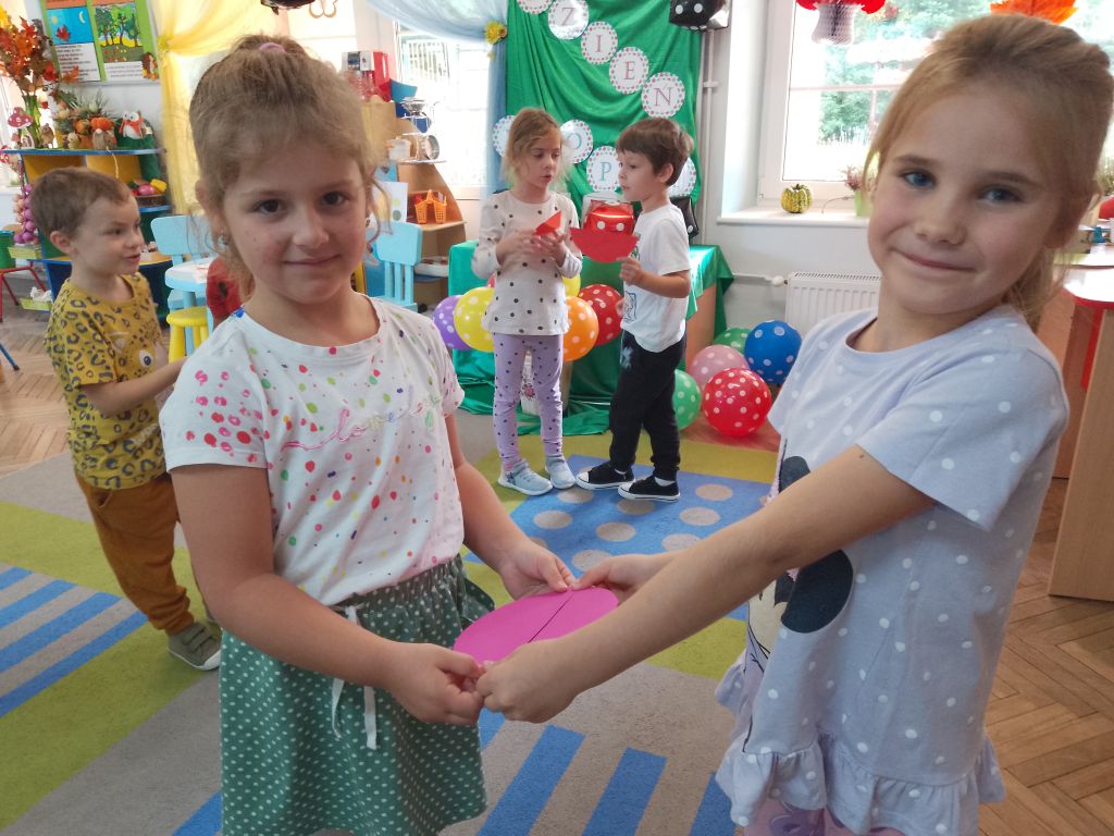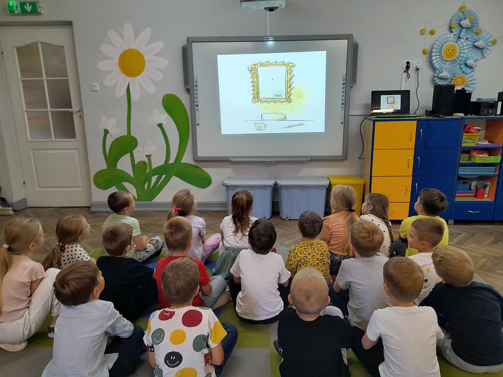 15.09.2025 r. dzieci obchodziły święto kreatywności czyli "Dzień Kropki". Inspiracją do wspólnego świętowania była bajka pt. "Kropka". Przedszkolaki z radością uczestniczyły w zabawach z kropką w roli głównej: układały kropkę z kolorowych kubeczków, brały udział w grach interaktywnych z wykorzystaniem tablicy multimedialnej, w kropkowej gimnastyce, zabawach przy muzyce, a także z wykorzystaniem chusty animacyjnej i balonów w kropki. Wykonały również pracę plastyczną tworząc kropkowe dzieła.
