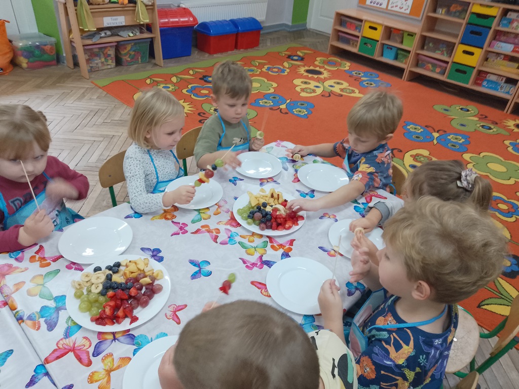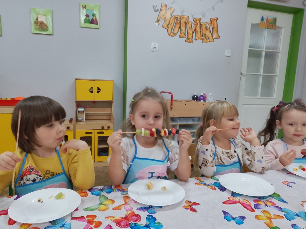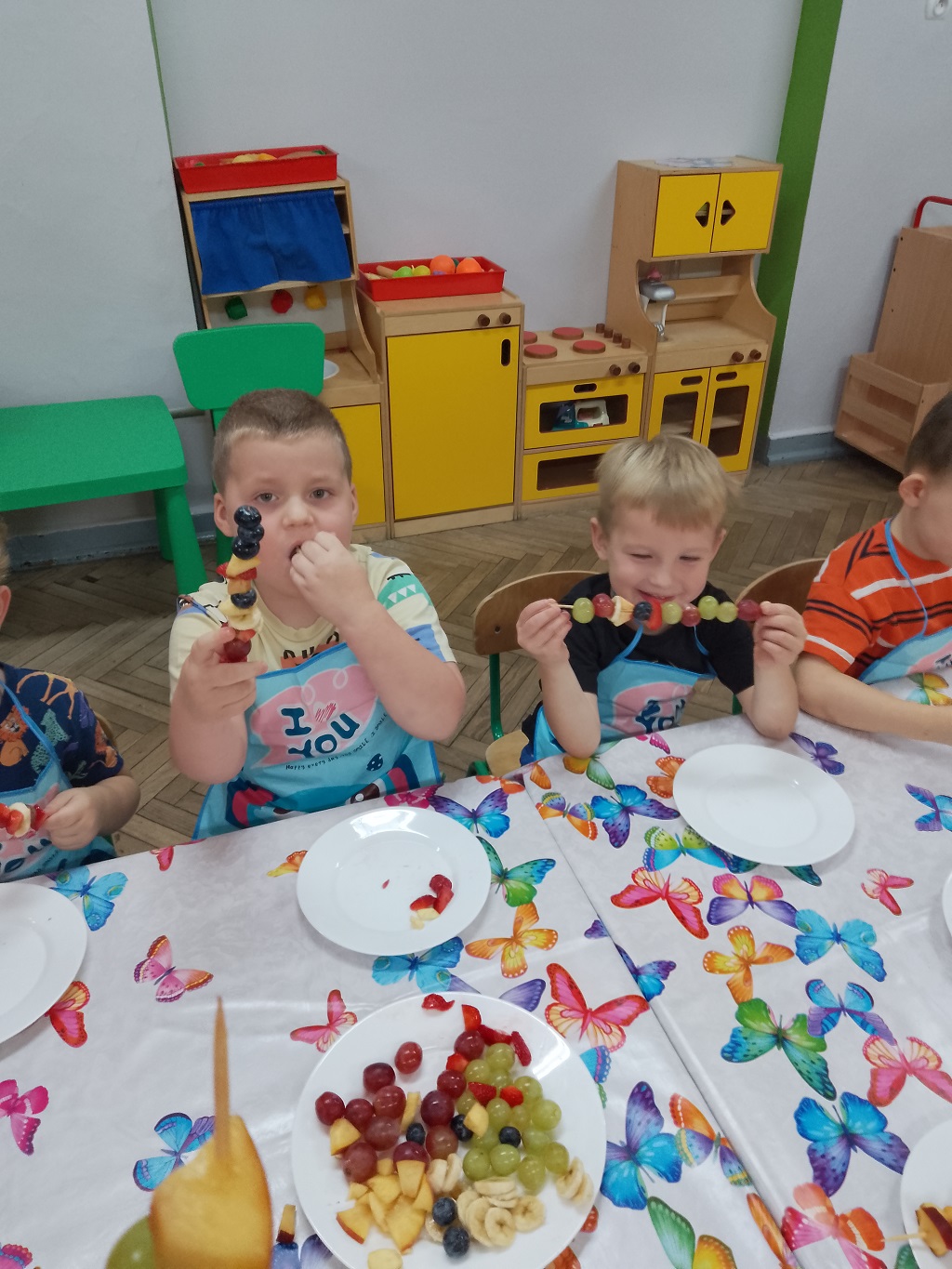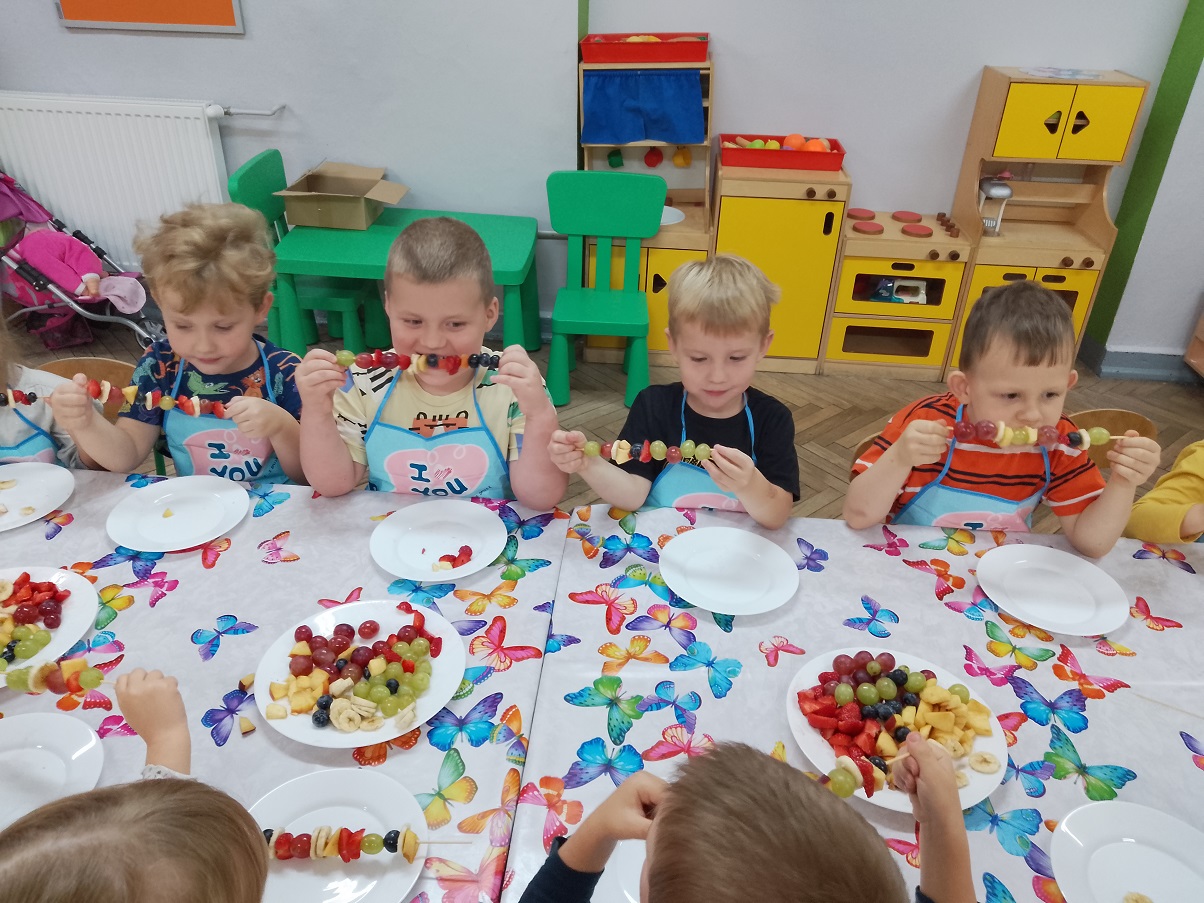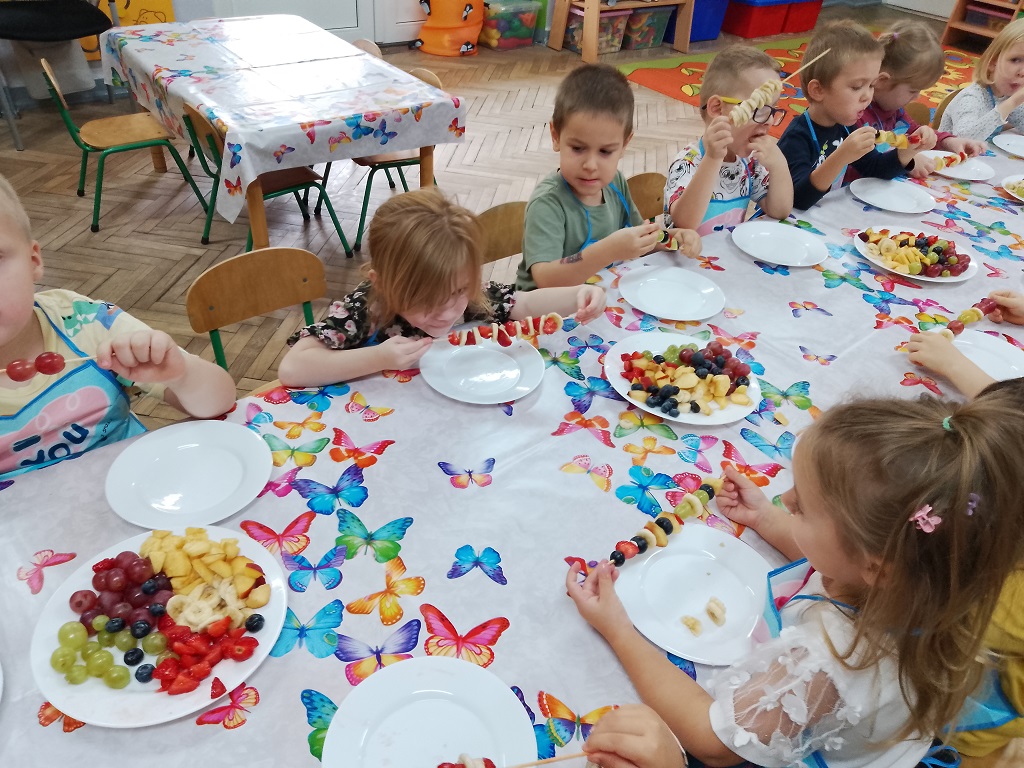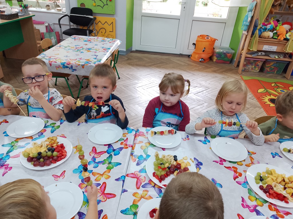 Dzisiaj dzieci z grupy „Motylków” poznawały różne owoce, ich wygląd i smak oraz wartości odżywcze. Przedszkolaki samodzielnie przygotowały owocowe szaszłyki. Pracowicie nabijały na patyczki ulubione owoce, a kiedy szaszłyki były już gotowe , ze smakiem je zjadaliśmy. Okazało się, że owoce bardzo dzieciom smakowały, co widać na zdjęciach. Było to ciekawe i „smaczne zajęcie”.