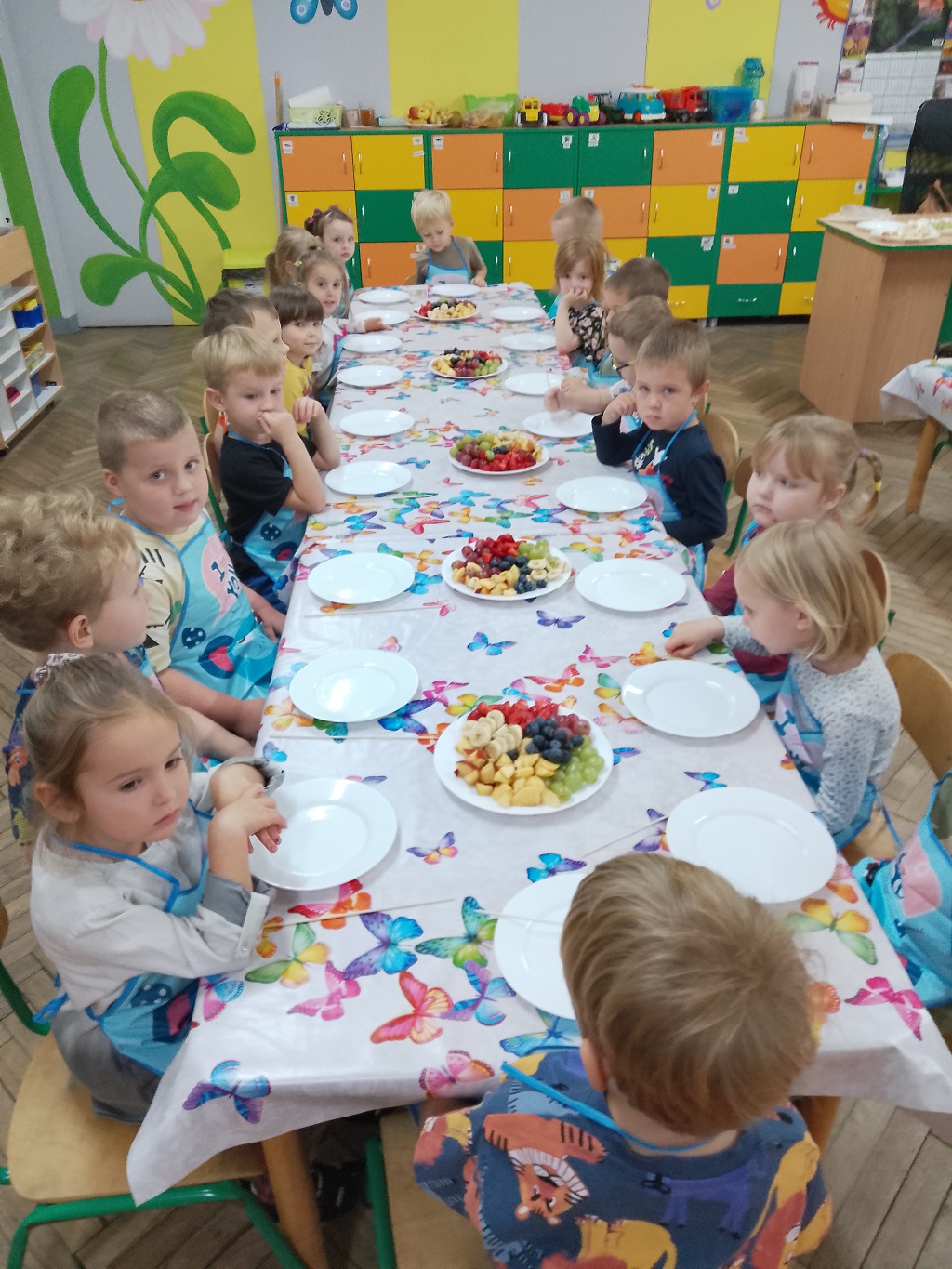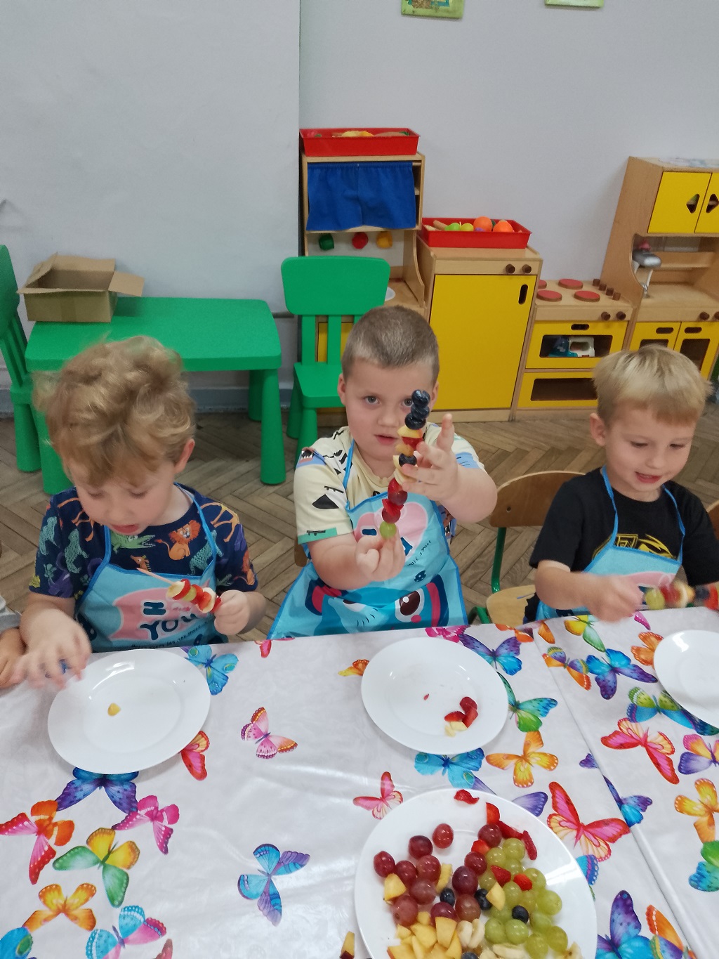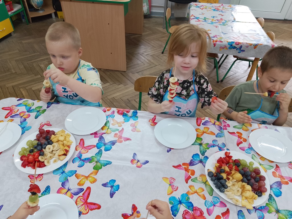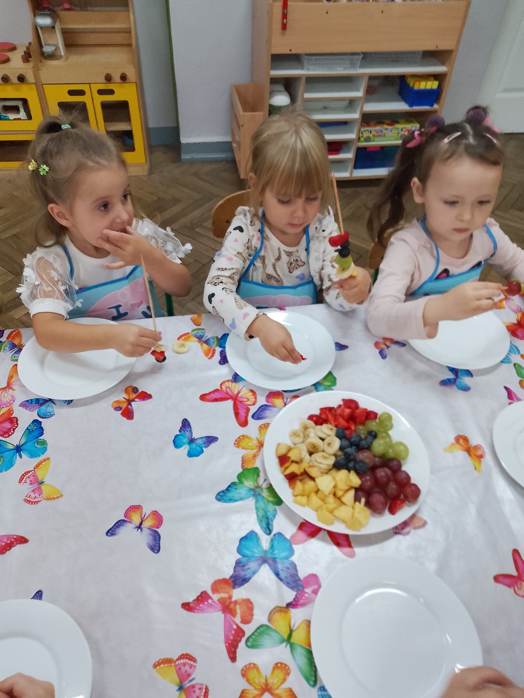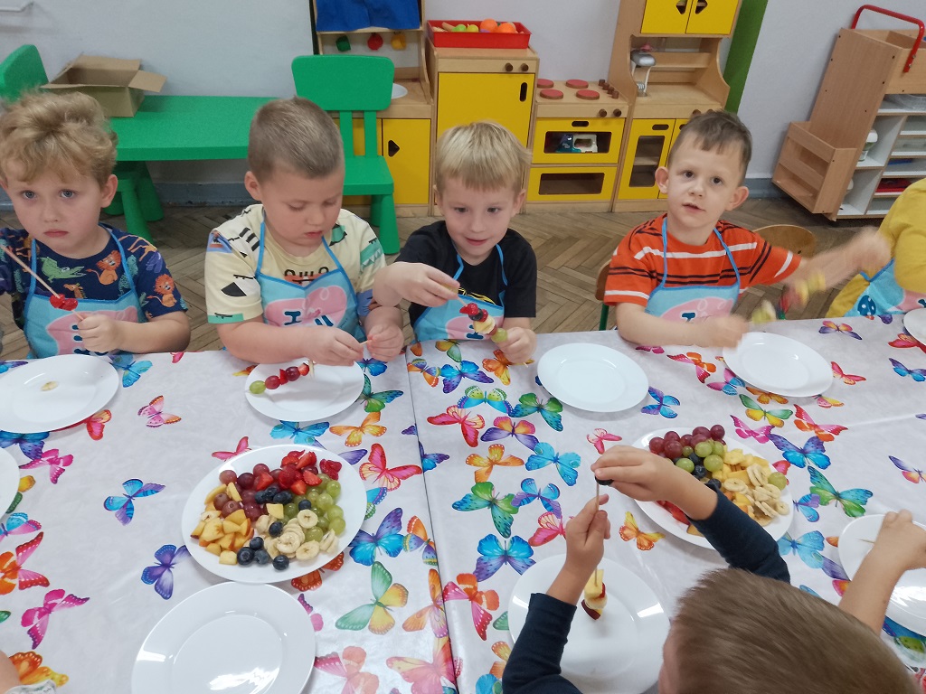 Dzisiaj dzieci z grupy „Motylków” poznawały różne owoce, ich wygląd i smak oraz wartości odżywcze. Przedszkolaki samodzielnie przygotowały owocowe szaszłyki. Pracowicie nabijały na patyczki ulubione owoce, a kiedy szaszłyki były już gotowe , ze smakiem je zjadaliśmy. Okazało się, że owoce bardzo dzieciom smakowały, co widać na zdjęciach. Było to ciekawe i „smaczne zajęcie”.