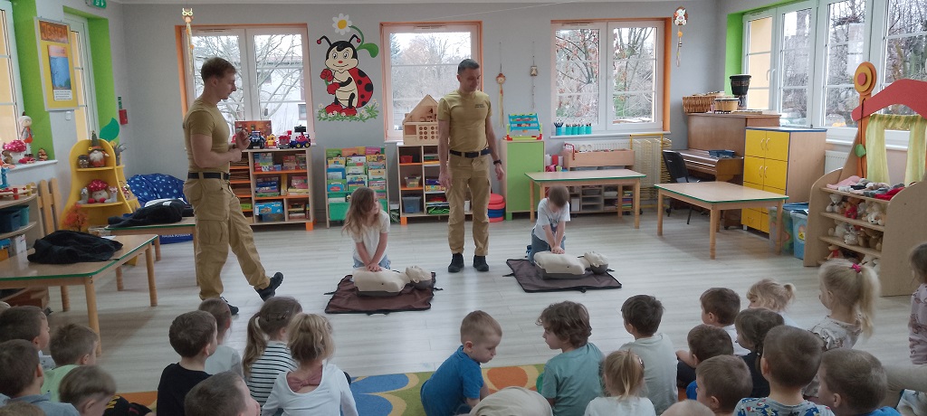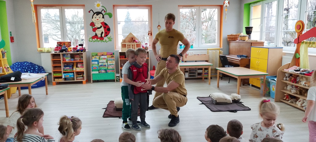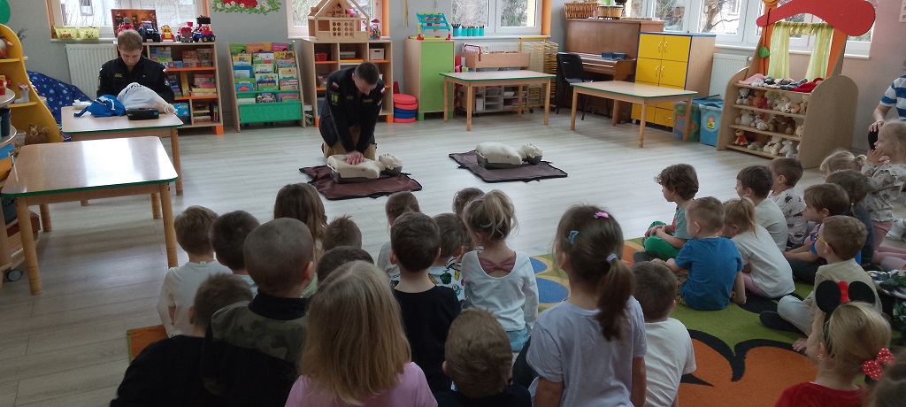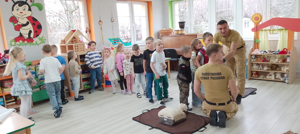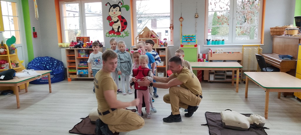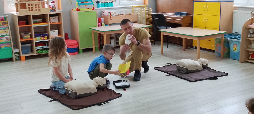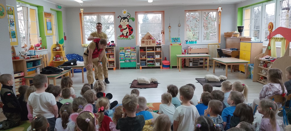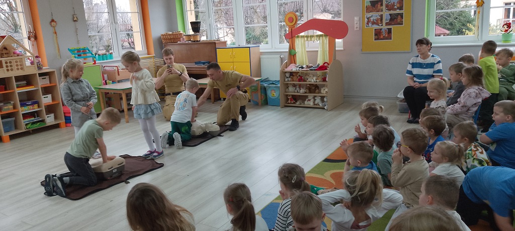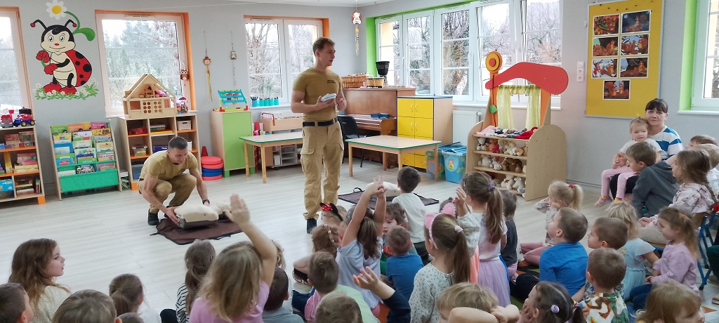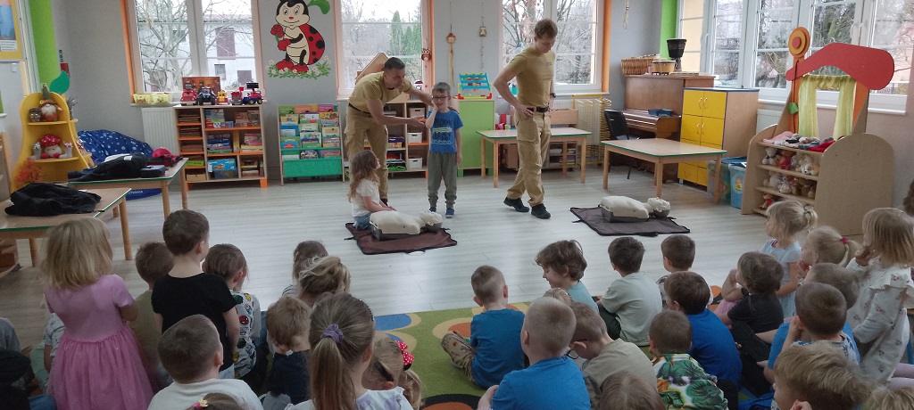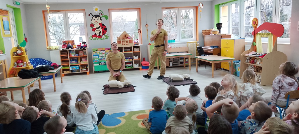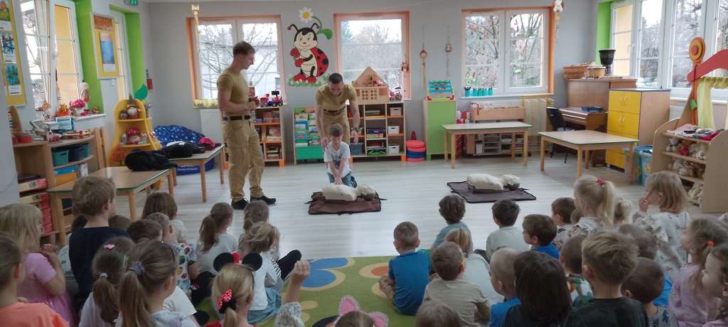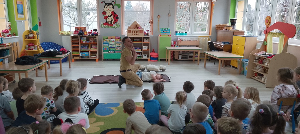 Dnia 12.11.2025 r. odwiedzili nasze przedszkole strażacy z Komendy Powiatowej Państwowej Straży Pożarnej w Kutnie. Podczas spotkania dzieci miały okazję oglądania pokazu udzielania pierwszej pomocy, brały udział w działaniach praktycznych z wykorzystaniem fantoma, ćwiczyły ułożenie poszkodowanego w pozycji bezpiecznej. Wzbogaciły również wiedzę o trudnej i odpowiedzialnej pracy strażaka, utrwaliły numery alarmowe. Duże zainteresowanie wzbudziły urządzenia pokazywane przez strażaków, takie jak czujki dymu, defibrylator AED, dzięki któremu przywraca się prawidłową pracę serca u osoby poszkodowanej.