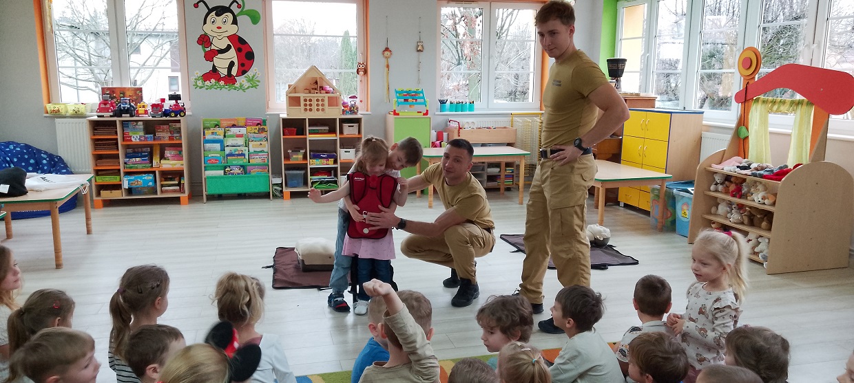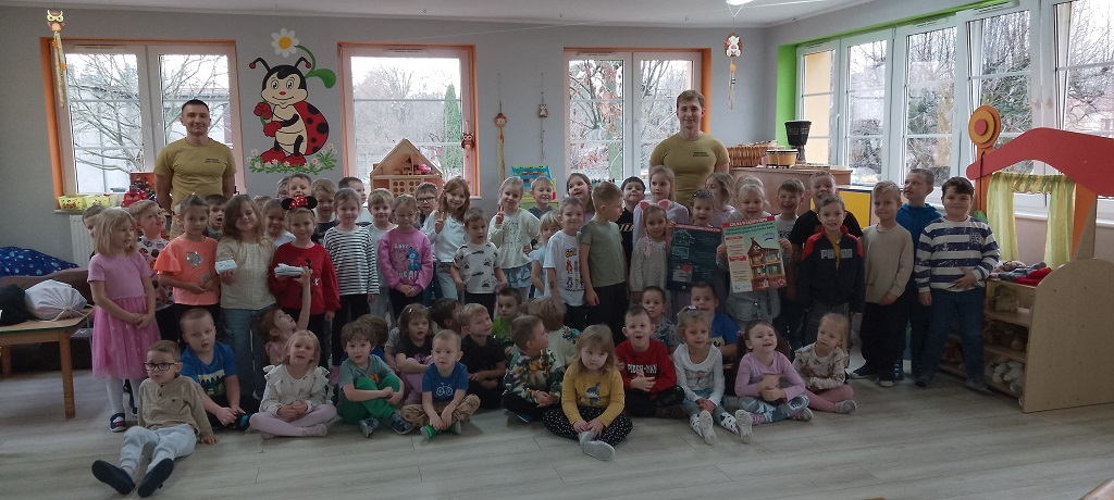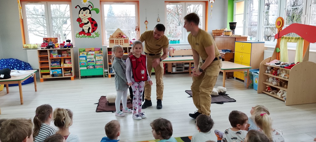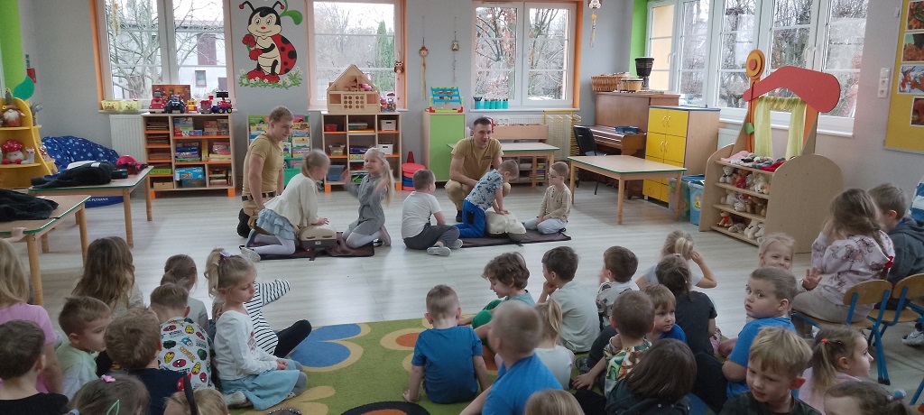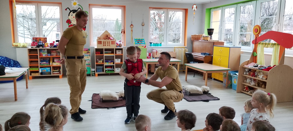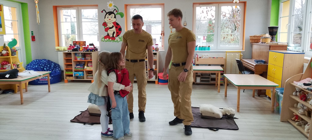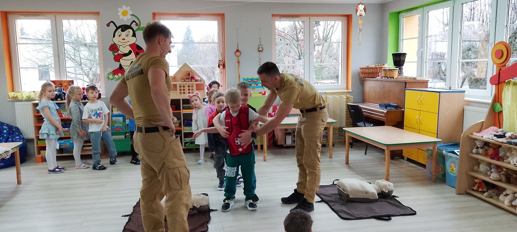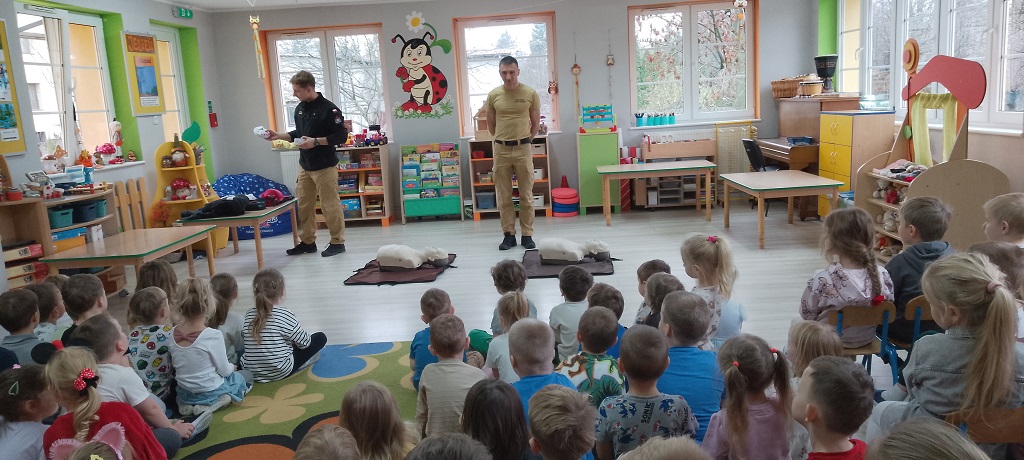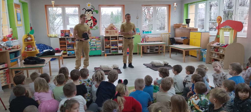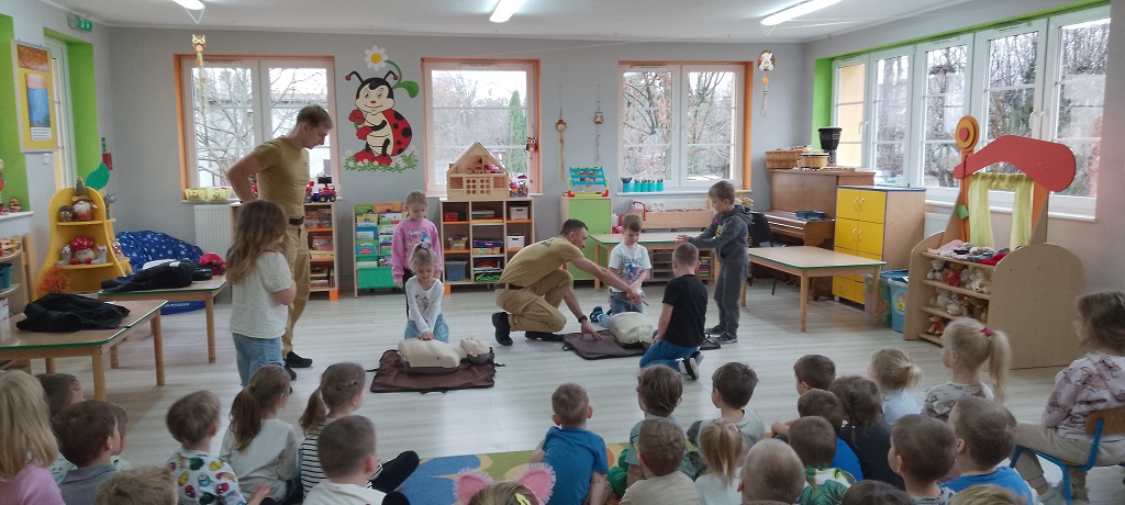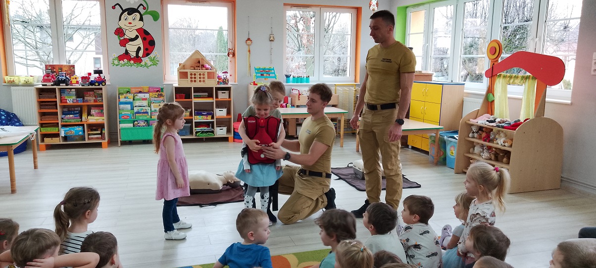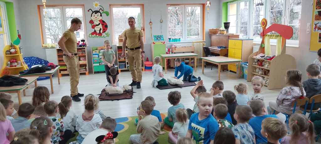 Dnia 12.11.2025 r. odwiedzili nasze przedszkole strażacy z Komendy Powiatowej Państwowej Straży Pożarnej w Kutnie. Podczas spotkania dzieci miały okazję oglądania pokazu udzielania pierwszej pomocy, brały udział w działaniach praktycznych z wykorzystaniem fantoma, ćwiczyły ułożenie poszkodowanego w pozycji bezpiecznej. Wzbogaciły również wiedzę o trudnej i odpowiedzialnej pracy strażaka, utrwaliły numery alarmowe. Duże zainteresowanie wzbudziły urządzenia pokazywane przez strażaków, takie jak czujki dymu, defibrylator AED, dzięki któremu przywraca się prawidłową pracę serca u osoby poszkodowanej.