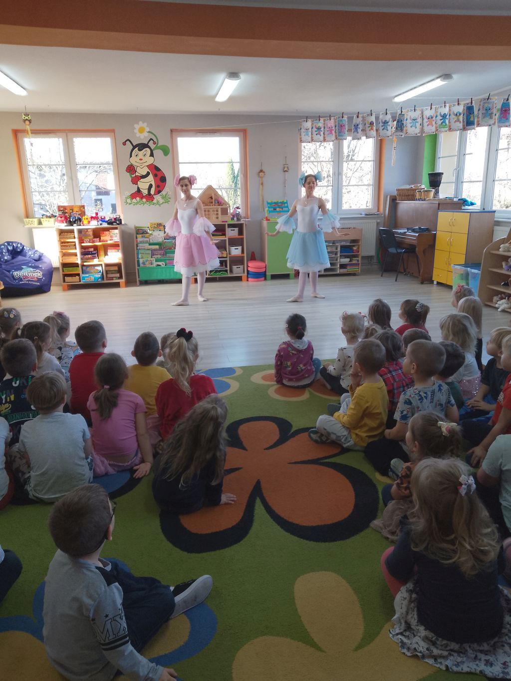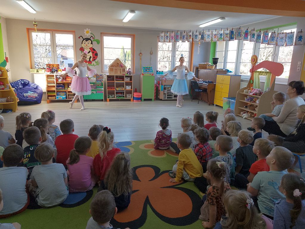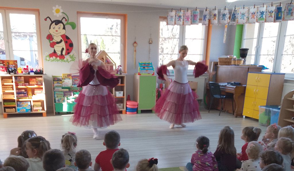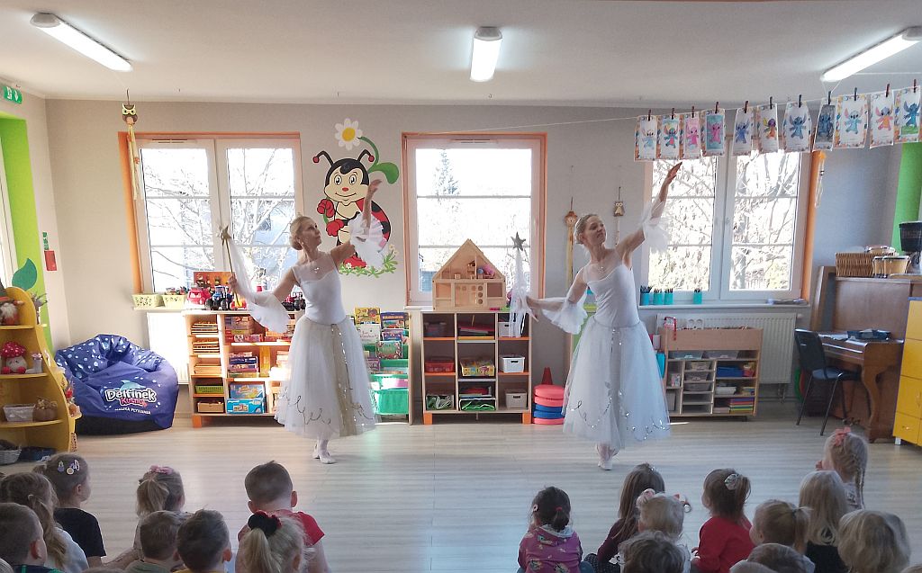 Dnia 06.11.2025 r. odbyło się w naszym przedszkolu przedstawienie baletowe pt. "Tańce z baśni". Tancerki zaprezentowały tańce z "Dziadka do orzechów" i "Śpiącej królewny". Ponadto dzieci z radością uczestniczyły w zabawach tanecznych - dziewczynki wykonały "Taniec lalek", a chłopcy "Taniec robotów". Przedszkolaki dowiedziały się również co to jest rekwizyt i do czego jest wykorzystywany.