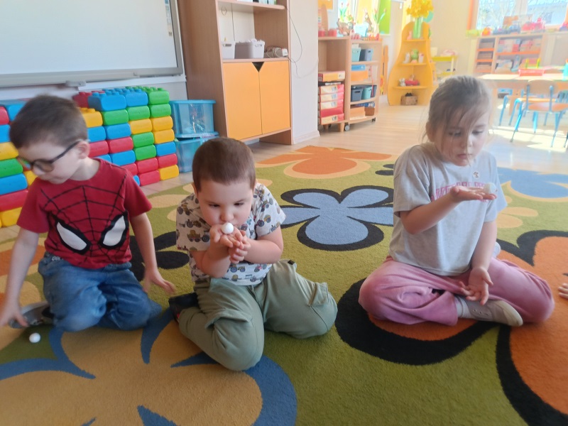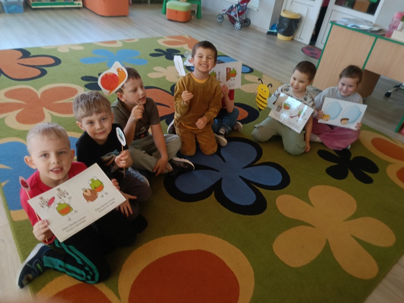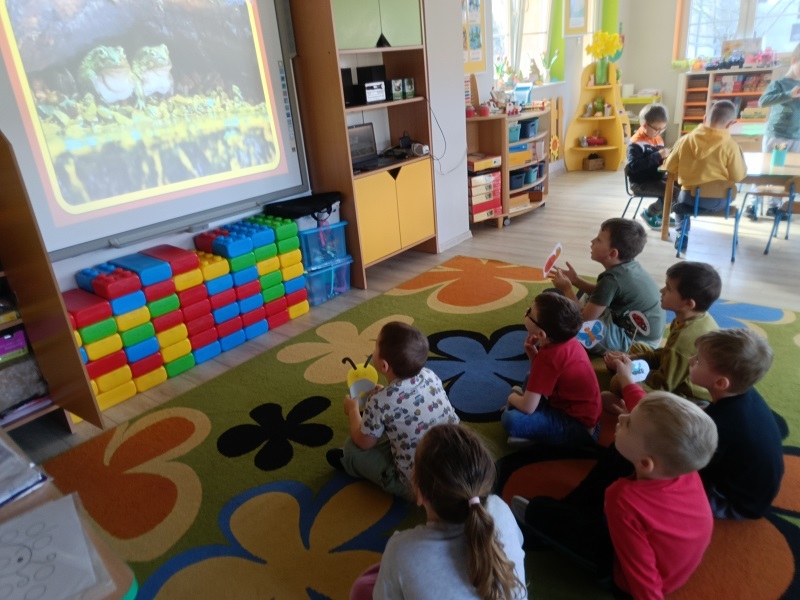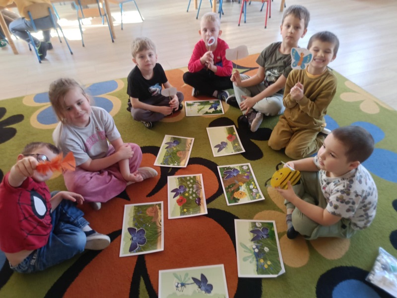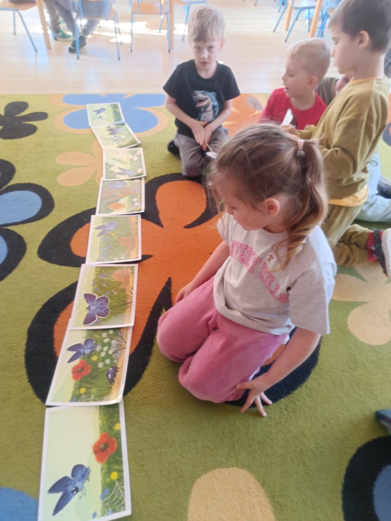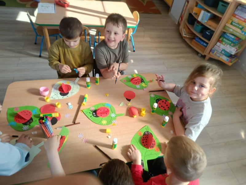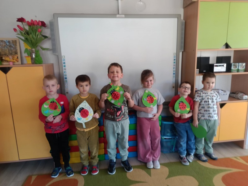 Na zajęciach dzieci wykonywały ćwiczenia oddechowe: dmuchały na piłeczki steropianowe i skrawki bibuły. Usprawniały aparat artykulacyjny, wykonując ćwiczenia zaprezentowane na obrazkach. Oglądały film ze zwierzątkami, które często można spotkać na łące. Układały w odpowiedniej kolejności historyjkę obrazkową pt. "na łące". Wykonały prace plastyczną - biedronki na liściu z kolorowych papierów.