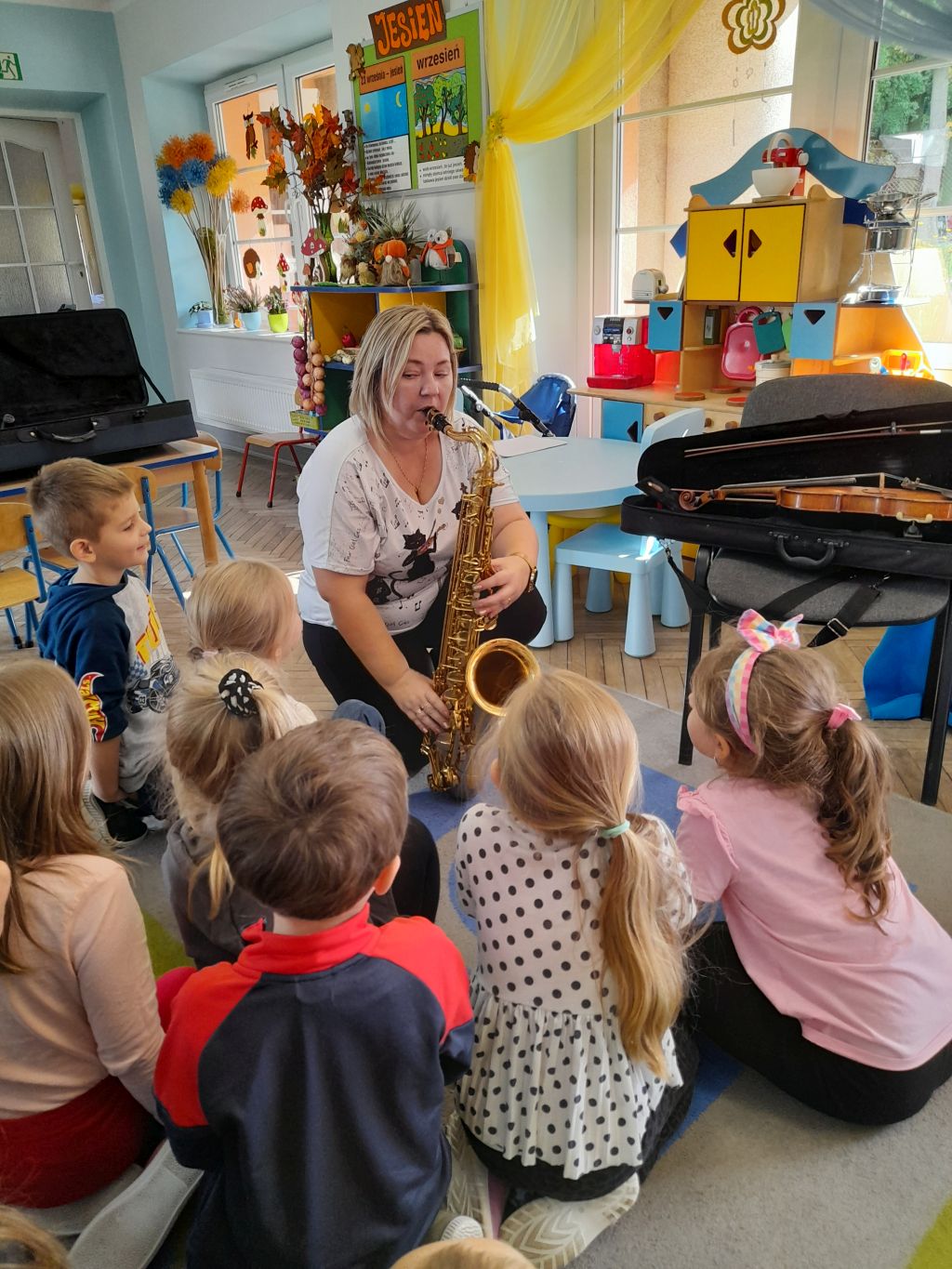 W ramach obchodów Dnia Muzyki gościliśmy w naszej grupie mamę Bartka, która jest muzykiem. Podczas zajęć Pani zaprezentowała dzieciom instrumenty muzyczne: skrzypce i saksofon. Dzieci miały możliwość poznania budowy instrumentów oraz sposobu gry na nich. Ponadto słuchały krótkich utworów muzycznych, uczestniczyły w zabawie muzyczno-ruchowej, a na koniec rozwiązały zagadkę rysunkową kolorując saksofon wg kodu. Zajęcia dostarczyły dzieciom wiele pozytywnych wrażeń i były wspaniałą okazją do rozwijania ich zainteresowań muzycznych.