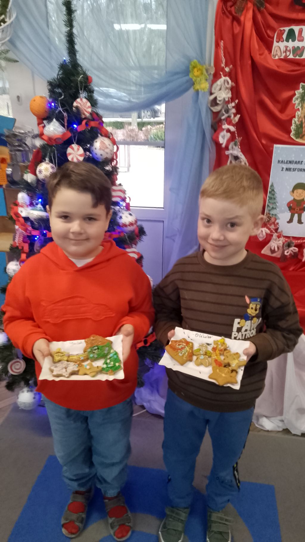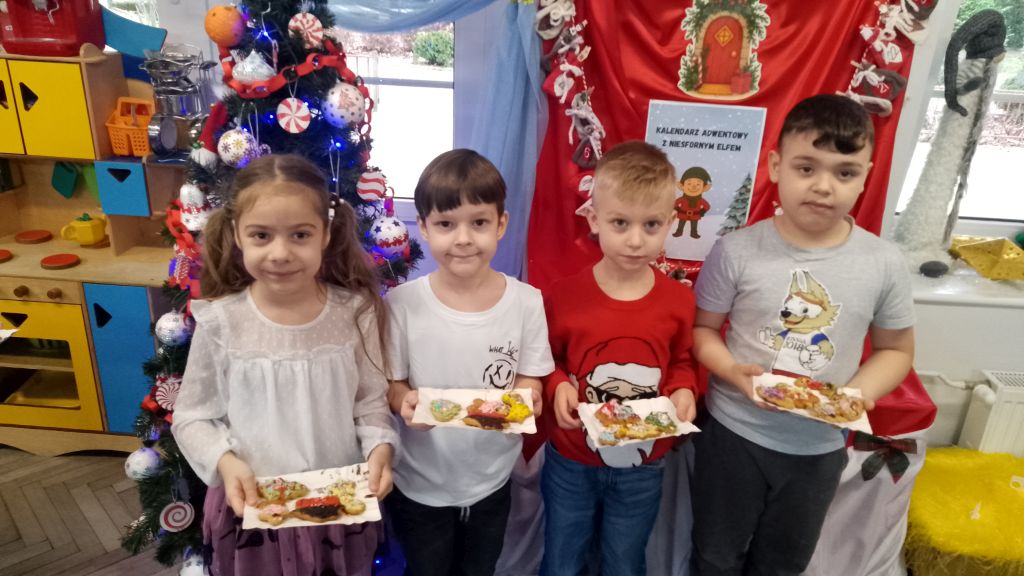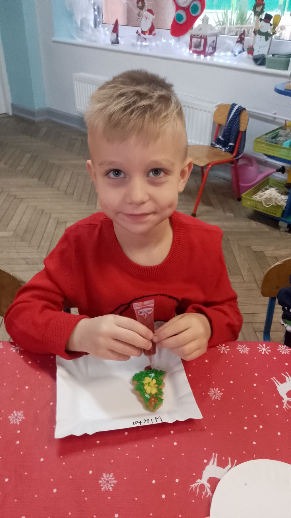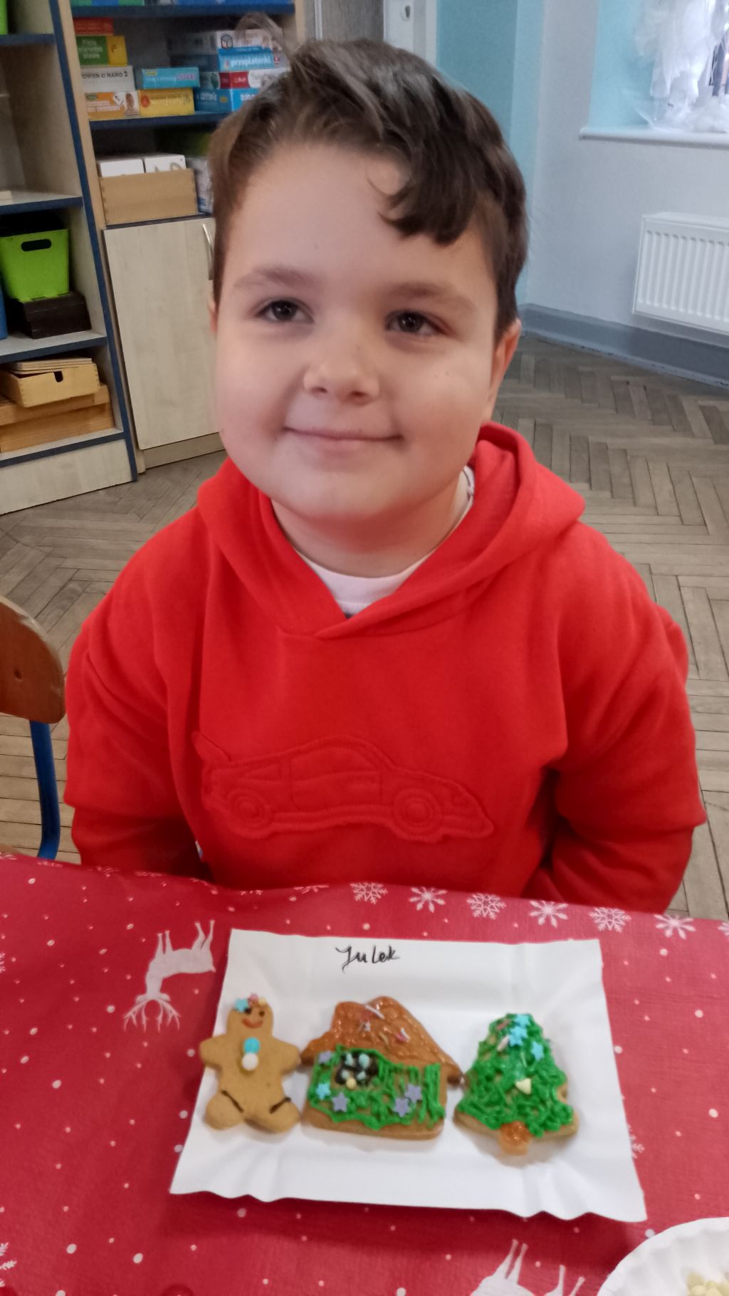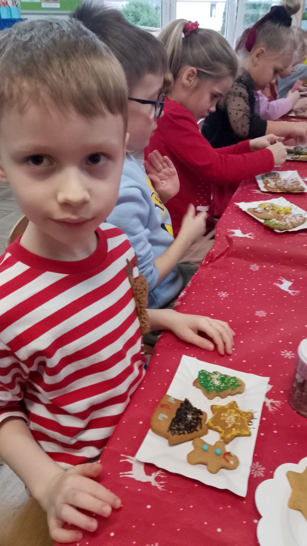 W piątek 12.12.2025 r. dzieci z grupy "Słoneczka" postanowiły własnoręcznie udekorować pierniczki. Każde dziecko z wielkim zaangażowaniem ozdabiało ciasteczka. Lukier i posypka sprawiły, że pierniki zamieniły się w kolorowe słodkości! Powstały prawdziwe dzieła sztuki. Każdy pierniczek wyglądał inaczej, był wyjątkowy i niepowtarzalny. Dzieci mogły zabrać pierniczki do domów. Była to wielka frajda i radość dla przedszkolaków. Poprzez wspólne działanie, samodzielne doświadczanie dzieci kultywowały tradycję, pobudzały inwencję twórczą, a przede wszystkim odczuwały radość świątecznego oczekiwania.