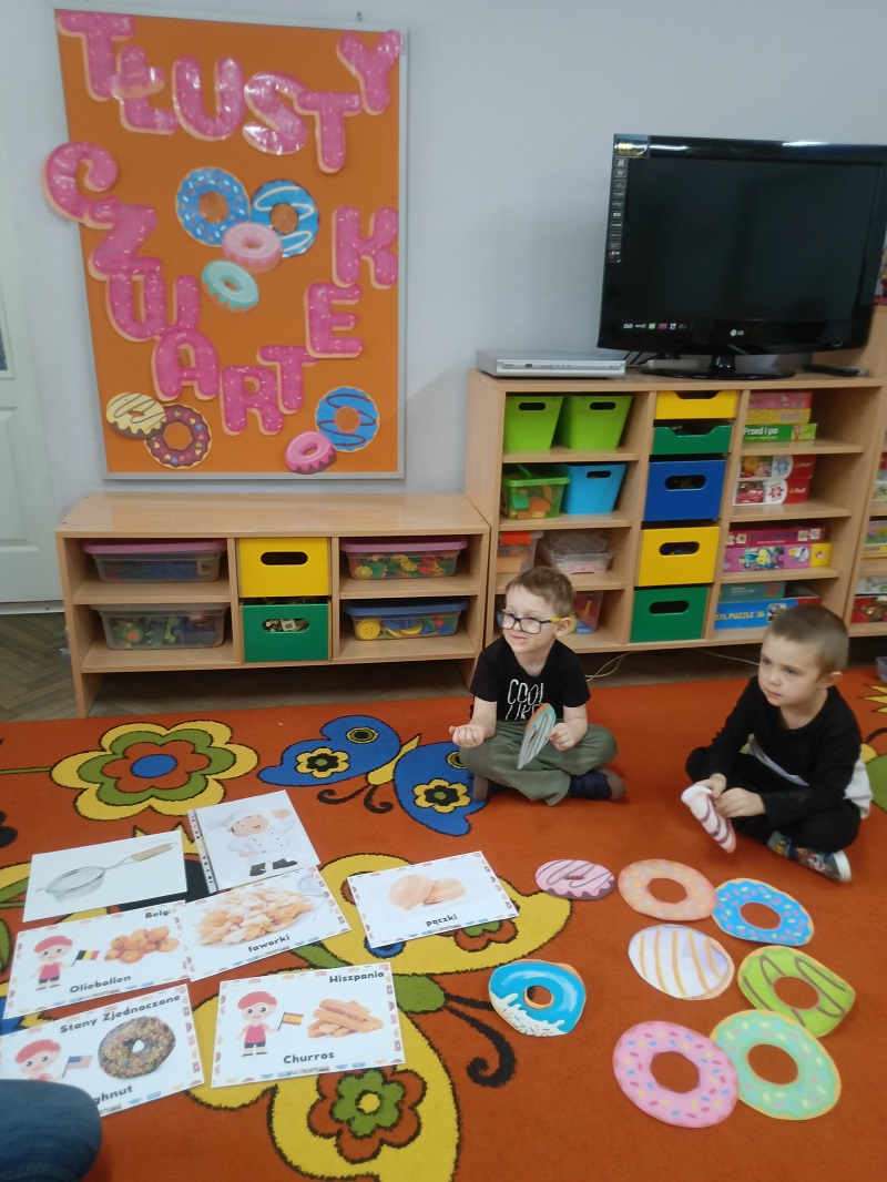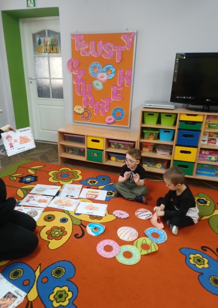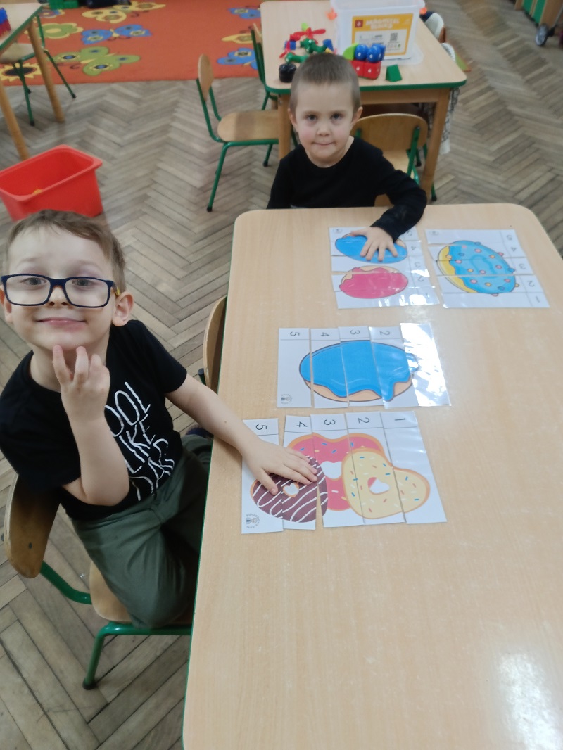 12 lutego obchodziliśmy Tłusty czwartek. Dzieci wspólnie z nauczycielem rozmawiały na temat pączków z różnych stron świata. Układały pięcioelementowe obrazki, tworząc ilustracje smakowitych pączków.