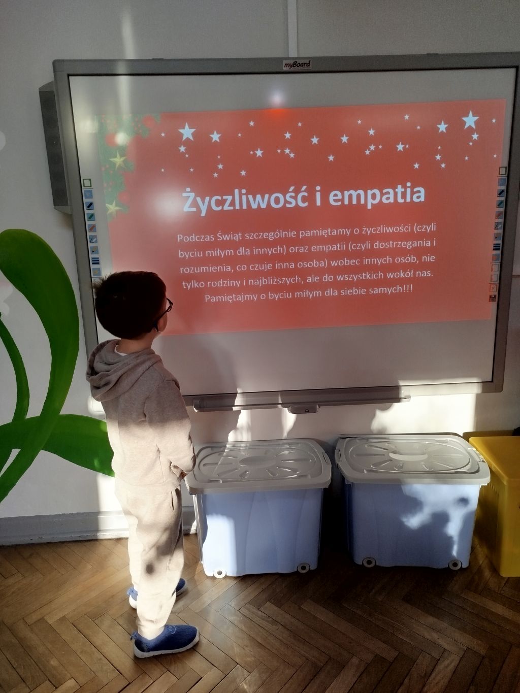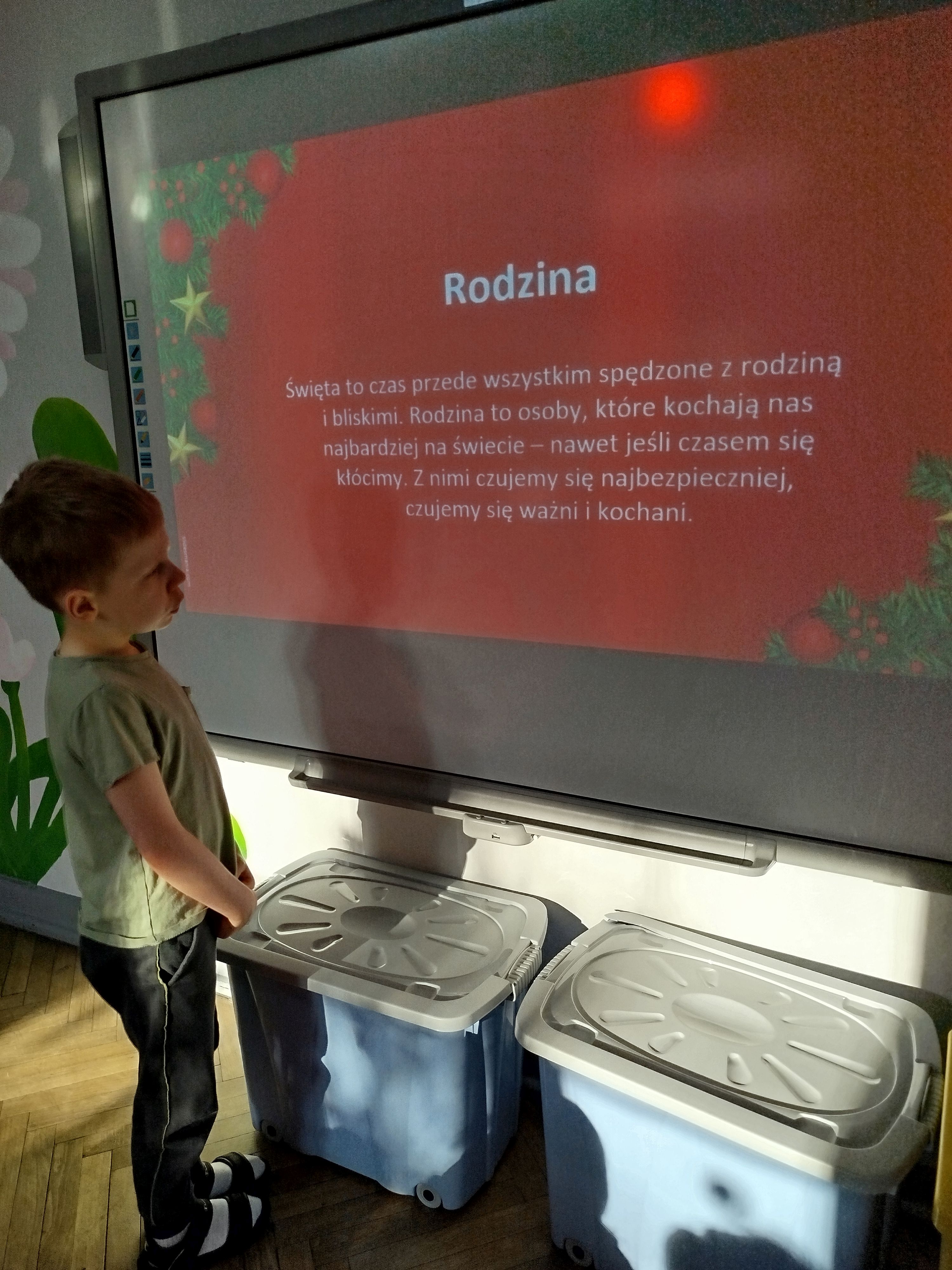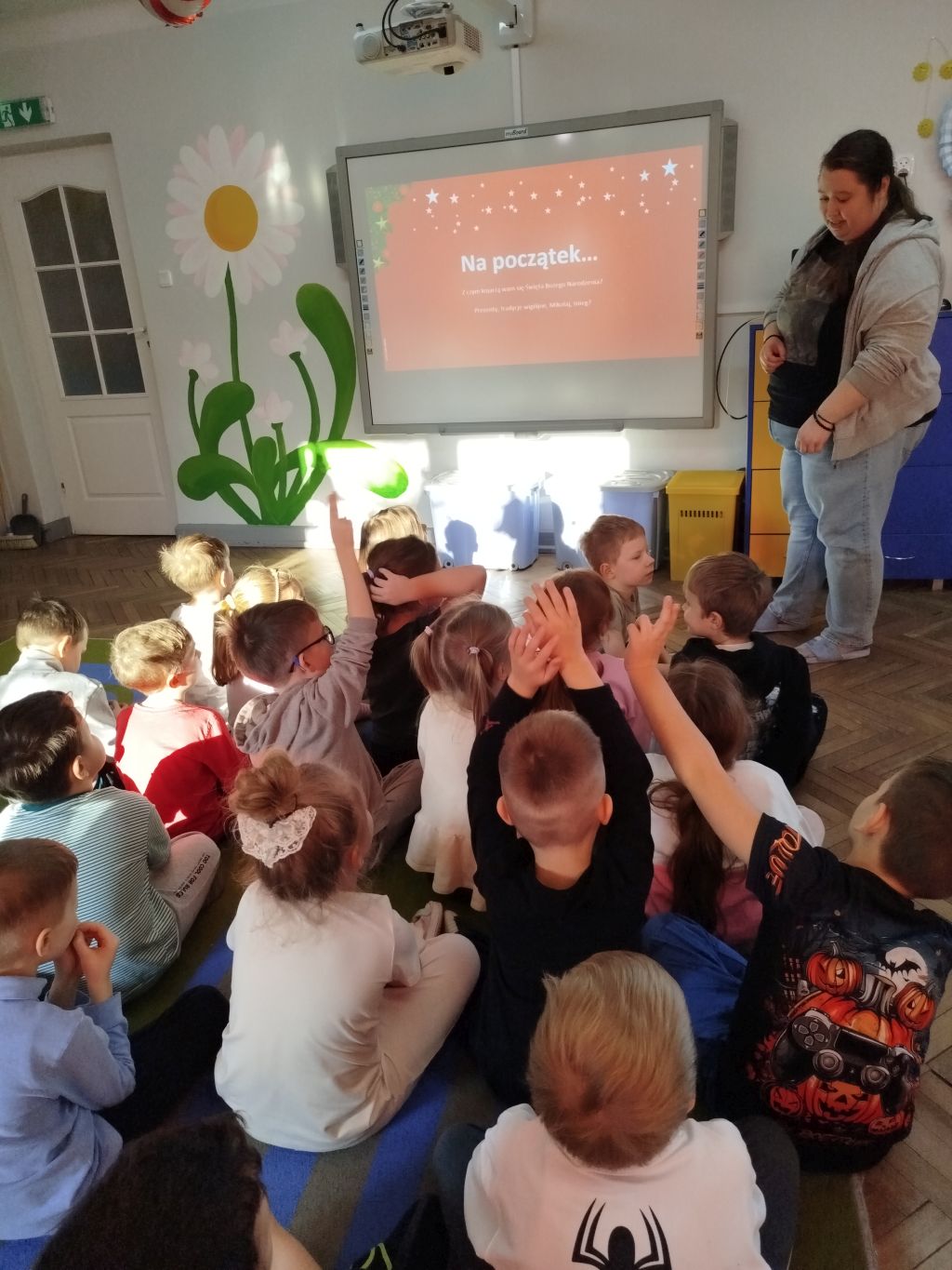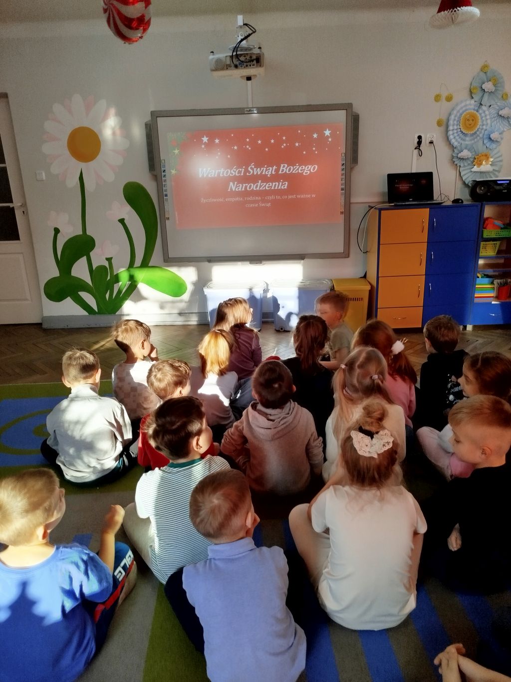 Dnia 11.12.2025 r. dzieci z grupy IV "Słoneczka" brały udział w zajęciu pt. "Wartości świąteczne. Rodzina, empatia, życzliwość - czyli to, co jest ważne w czasie Świąt". Zajęcie prowadziła Pani psycholog - pracownik przedszkola w ramach realizacji projektu edukacyjnego "Urok Świąt Bożego Narodzenia naszego regionu". Dzieci oglądały prezentację multimedialną oraz opowiadały o tradycjach wigilijnych w swojej rodzinie, o tym jak spędzają czas oraz jak kultywować wartości takie jak życzliwość, empatia, radość oraz pomaganie innym. Dzieci chętnie i aktywnie uczestniczyły w dyskusji.