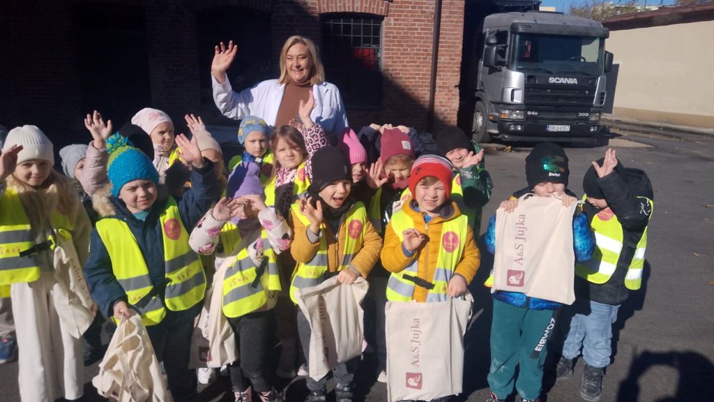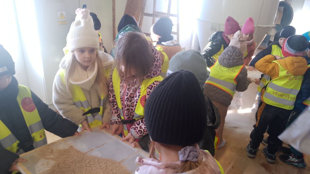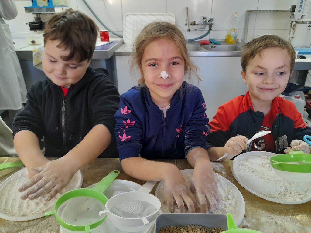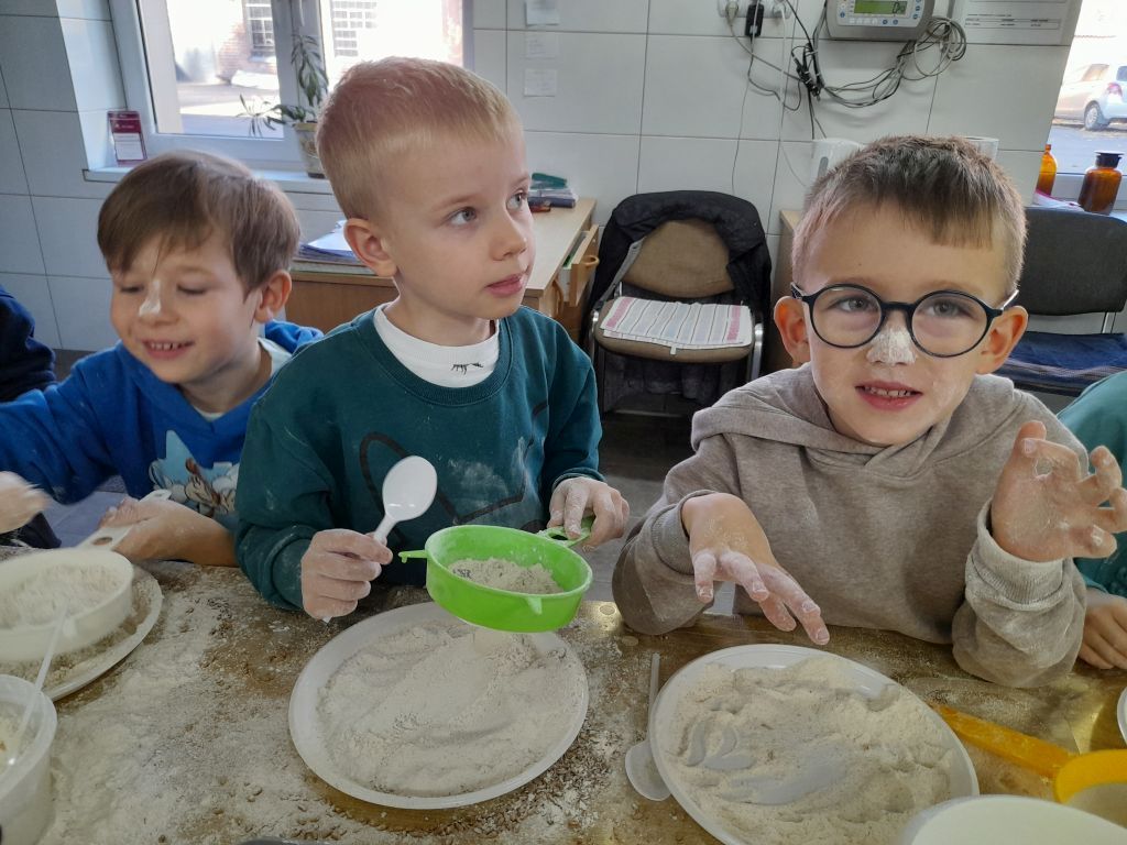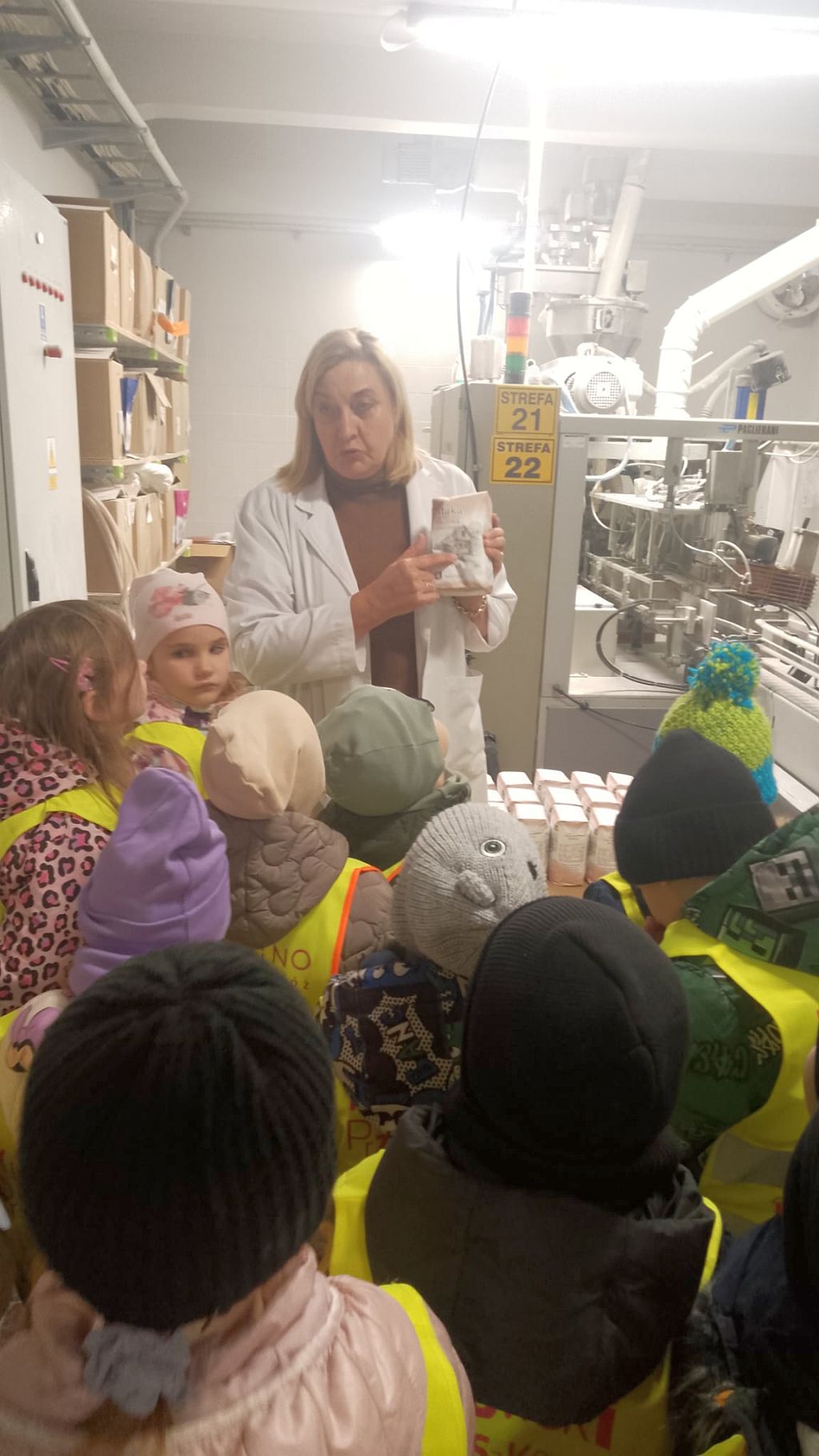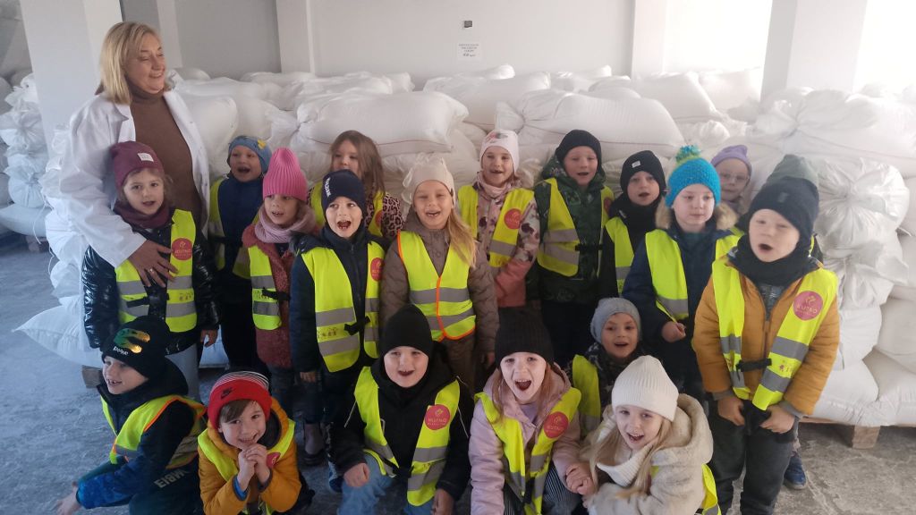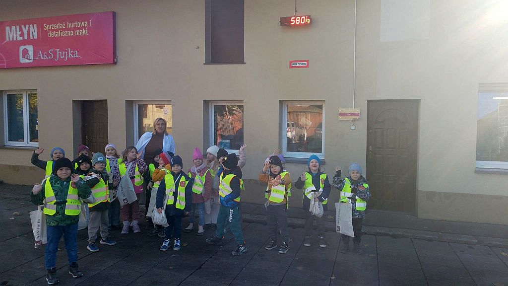 Dnia 20.10.2025 r. "Słoneczka" uczestniczyły w wycieczce do Młyna "A&S Jujka". Na początku Pani właścicielka opowiedziała dzieciom krótką historię młyna. Następnie przedszkolaki uczestniczyły w zajęciach warsztatowych w laboratorium. Podczas zabaw badawczych poznały różne rodzaje mąki oraz ziarno, z którego jest wytwarzana. Zajęcia w laboratorium dostarczyły dzieciom wiele radości i wrażeń sensorycznych. Kolejnym punktem wycieczki było zwiedzanie młyna. Pani właścicielka zaprezentowała dzieciom etapy wytwarzania mąki. Przechodząc przez halę produkcyjną wszyscy z ciekawością oglądali maszyny wykorzystywane do jej produkcji. Przedszkolaki zobaczyły również magazyn, w którym mąka zapakowana była w worki oraz maszynę do pakowania mąki w torebki. Miały także możliwość stanąć na ogromnej wadze znajdującej się przed młynem. Na koniec każde dziecko otrzymało upominek.