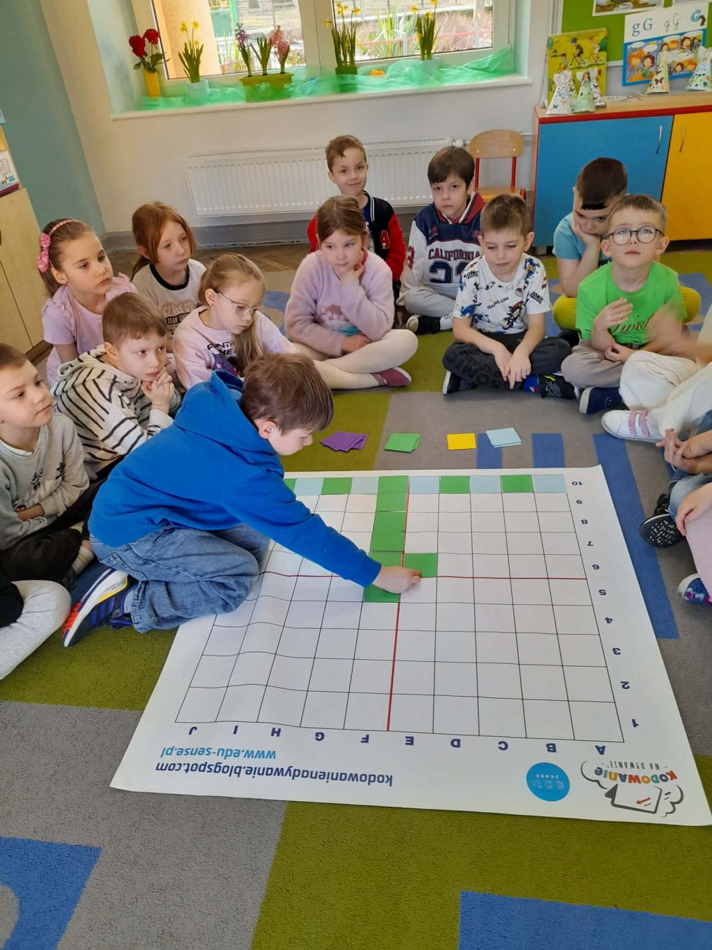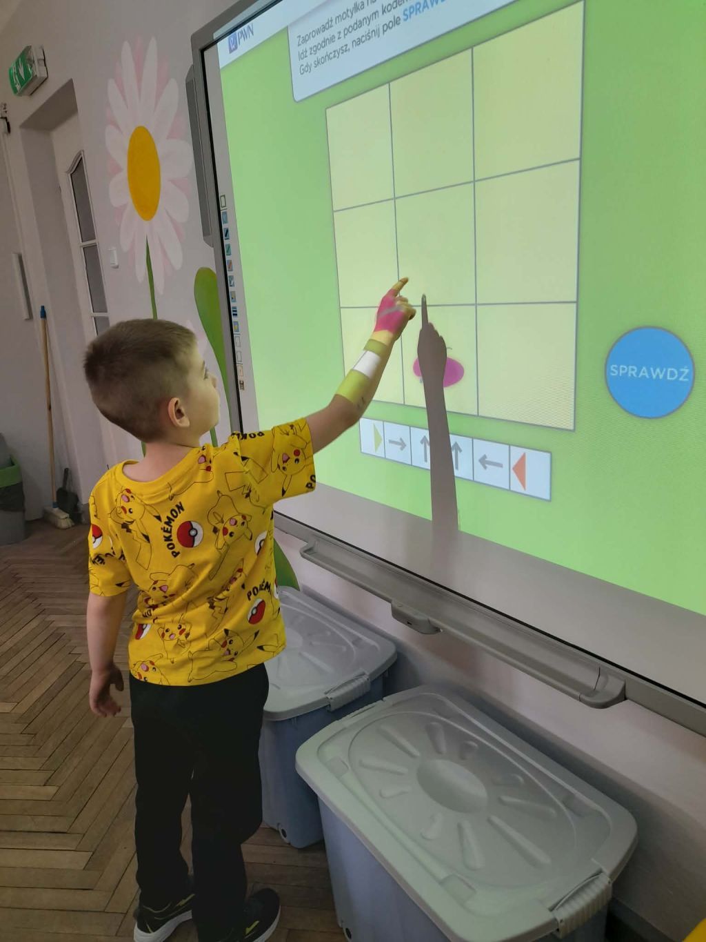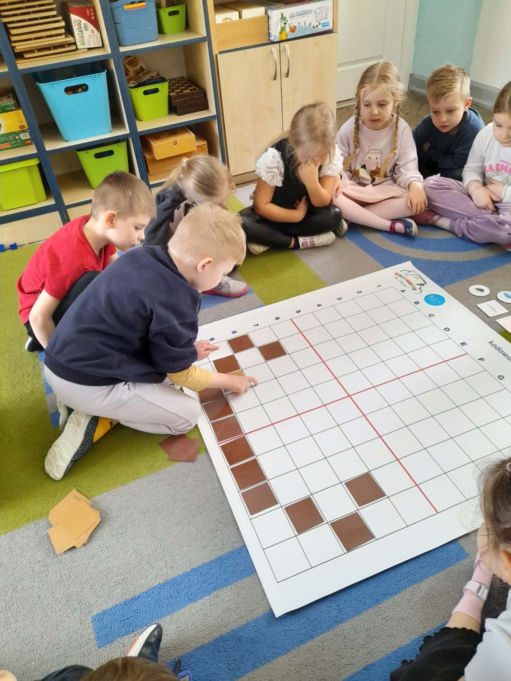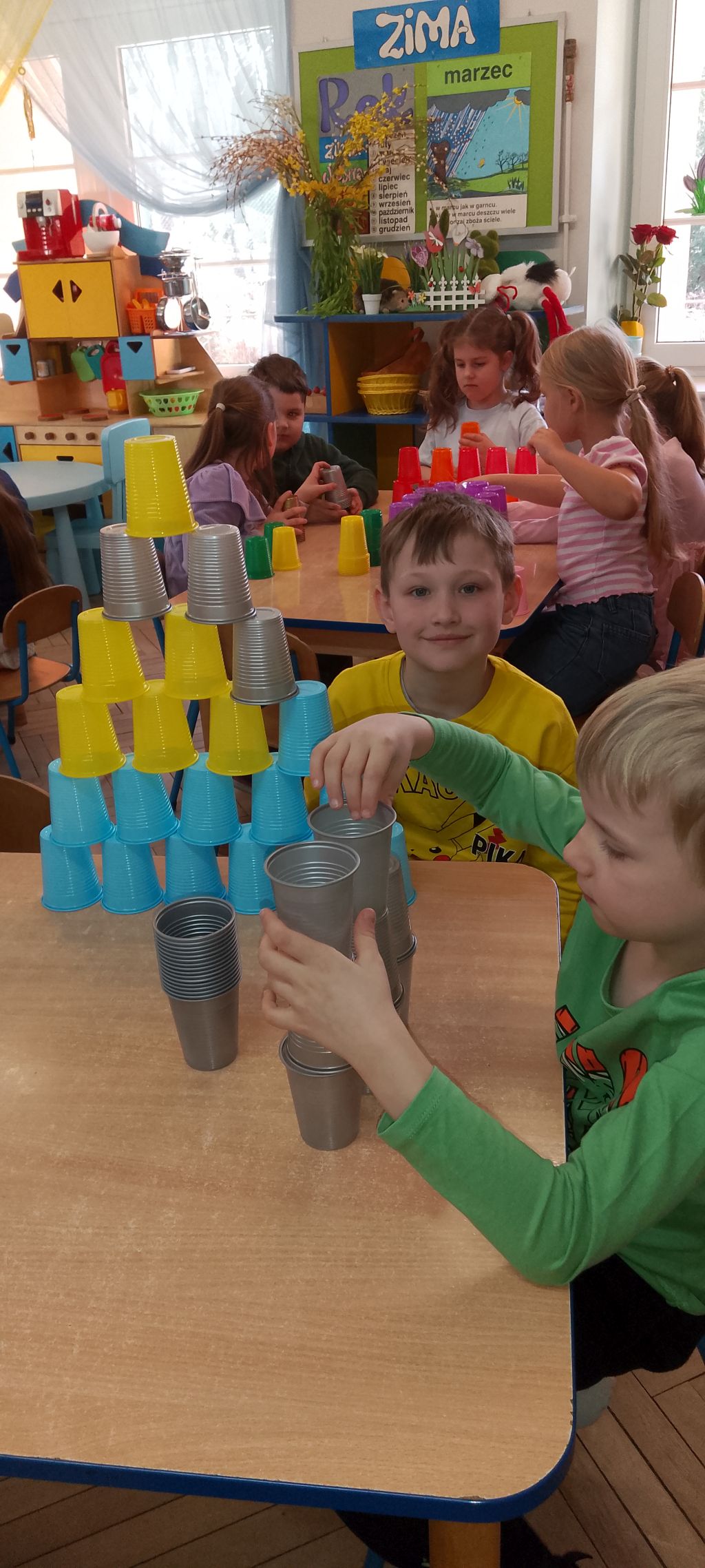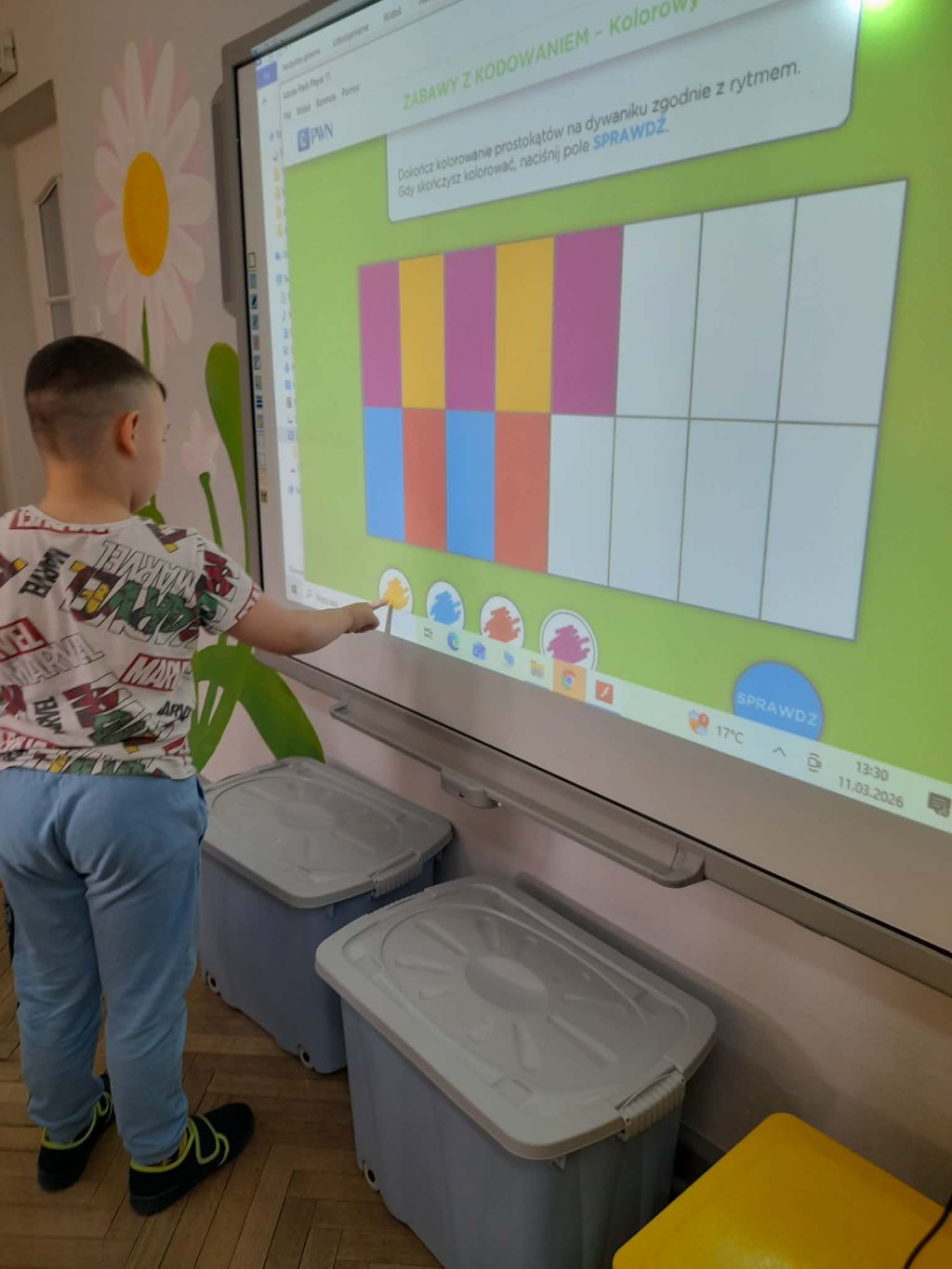 W marcu 2026 r. dzieci z grupy "Słoneczek" brały udział w zabawach z elementem kodowania w ramach programu "Uczymy dzieci programować. Dzieci bawiły się z wykorzystaniem kolorowych kubków - ustawiały wieże na podstawie podanego kodu, liczyły elementy. Chętne "Słoneczka" określały wynik dodawania i odejmowania. Realizowały również własne pomysły ustawiając dowolne konstrukcje. Ponadto uczestniczyły w zajęciach z wykorzystaniem maty do kodowania i tablicy multimedialnej ("W marcu jak w garncu”, "Prezenty od Wiosny"), korzystały z cyklu "Filmy, gry i zabawy multimedialne dla przedszkolaków" (Wyd. PWN). Dużo radości dostarczyły dzieciom zabawy z Ozobotami - robotami do kodowania. Podczas organizowanych zabaw dzieci rozwijały umiejętności matematyczne, planowania, odczytywania kodów, logiczne myślenie, percepcję wzrokową.