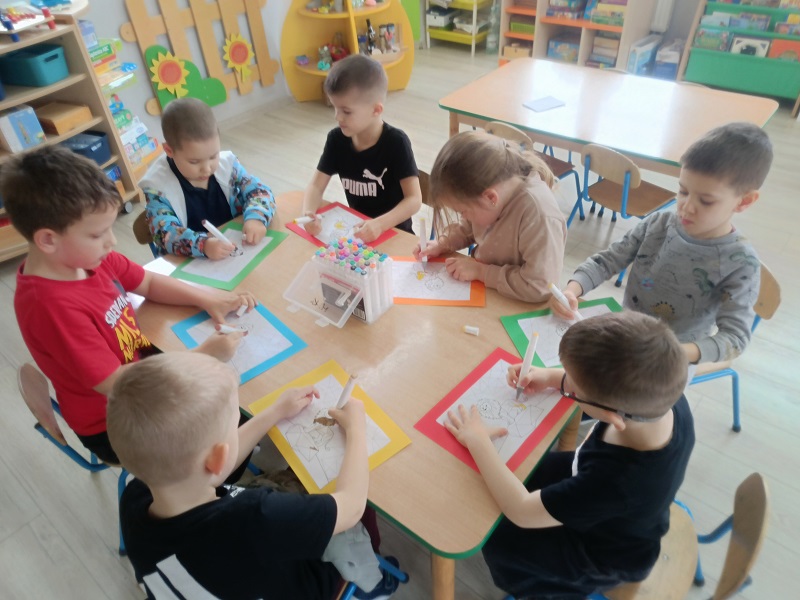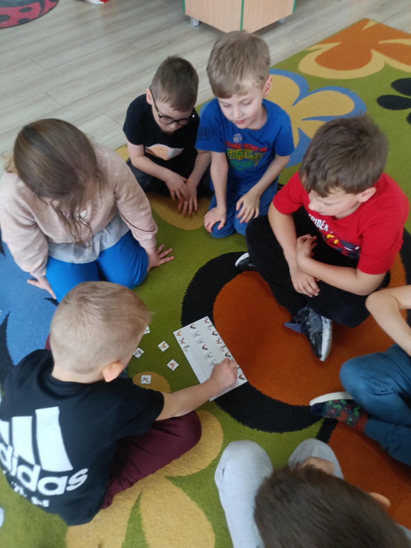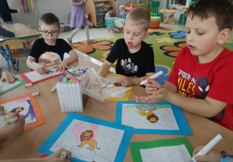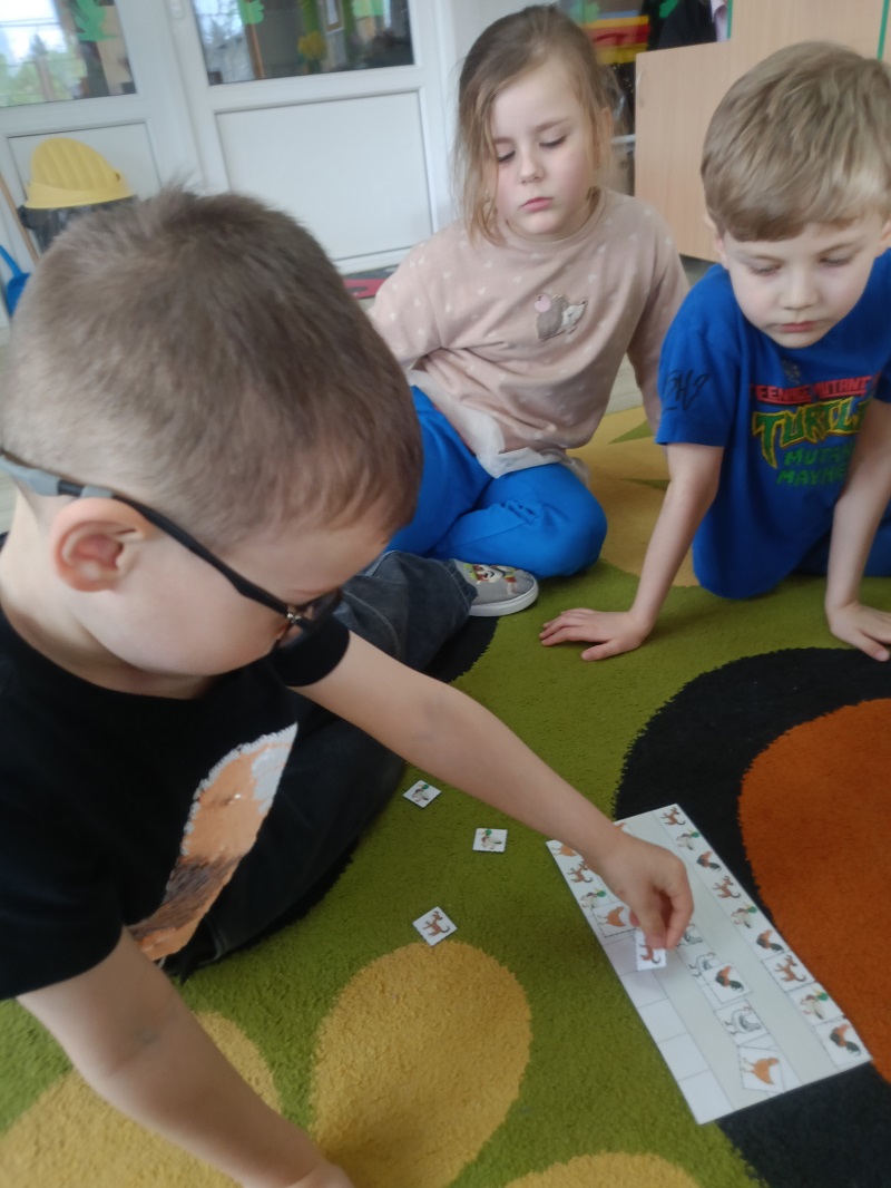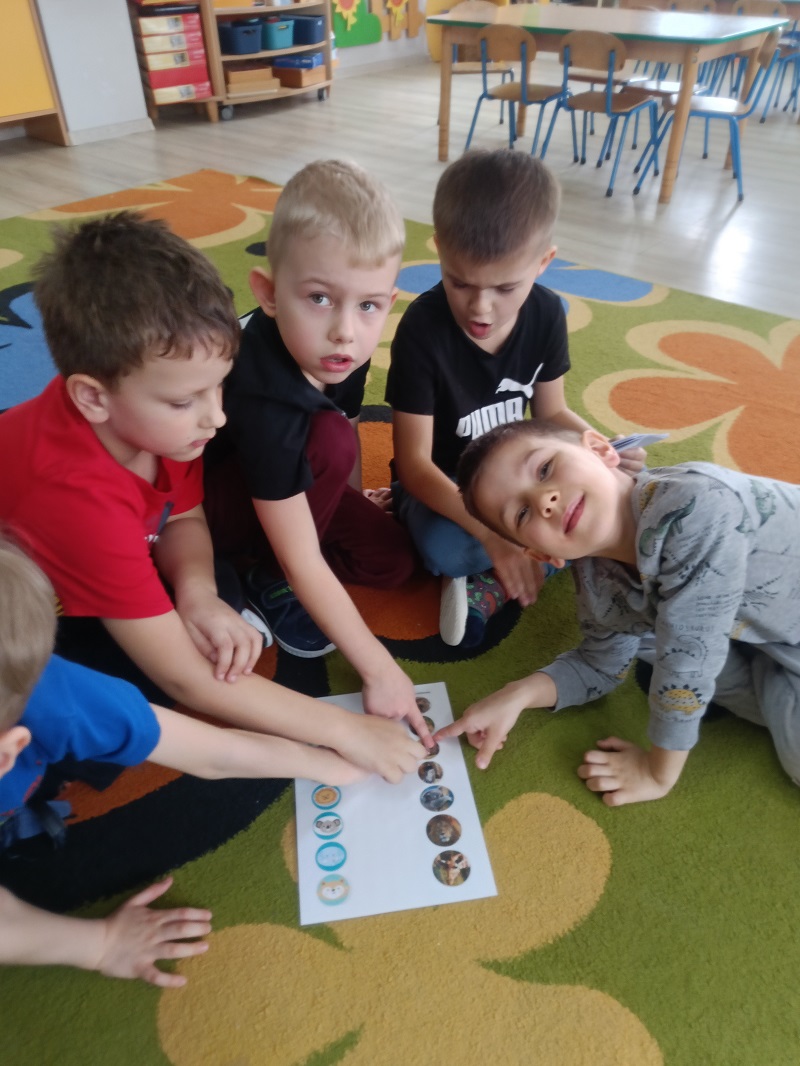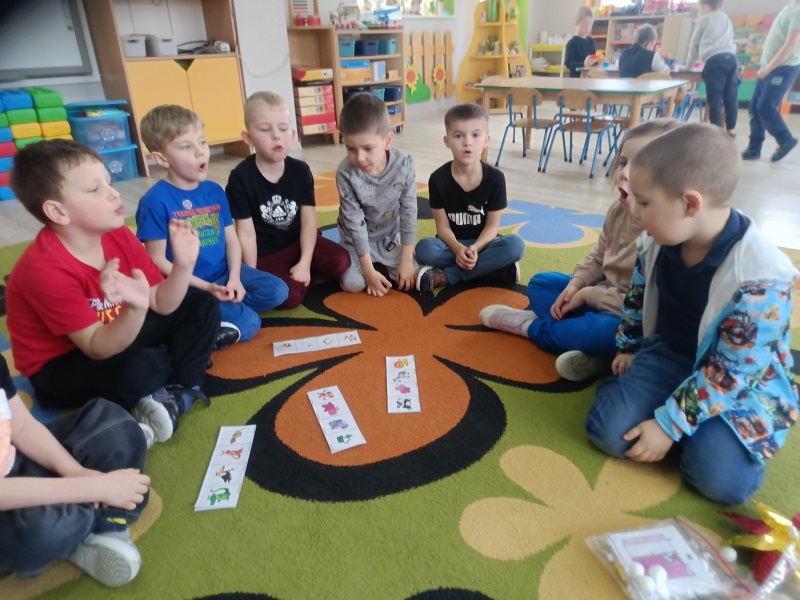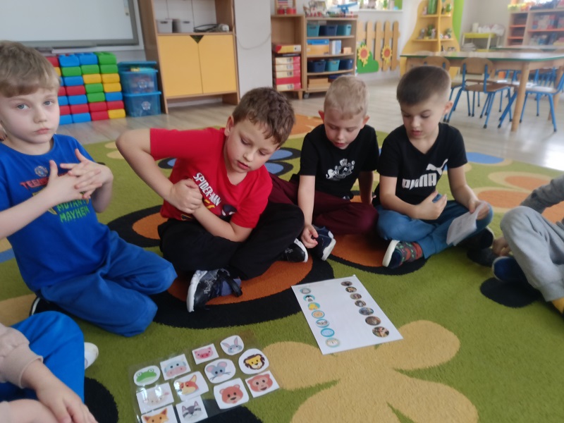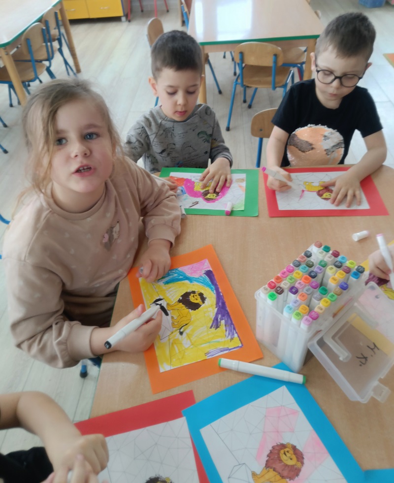 Dzieci podczas zajęć poszerzały zasób słownictwa poprzez nazywanie dzikich zwierząt. Uczyły się prawidłowego toru oddychania, dmuchając na steropianowe piłeczki i wiatraki. Usprawniały wargi i język, wykonując ćwiczenia umieszczone na ilustracjach. Wykonywały ćwiczenia dźwiękonaśladowcze, tworzyły rymy do podanych wyrazów oraz układały sekwencje według wzoru. Na końcu rozwiązywały zagadki słuchowe i zrobiły prace plastyczną za pomocą mazaków.